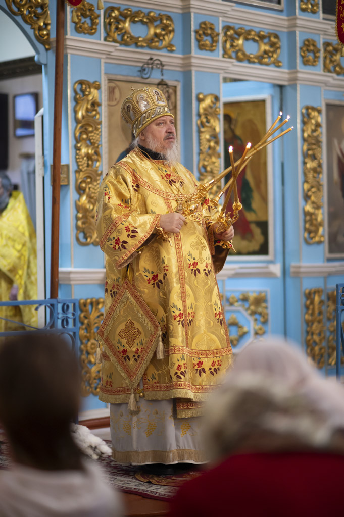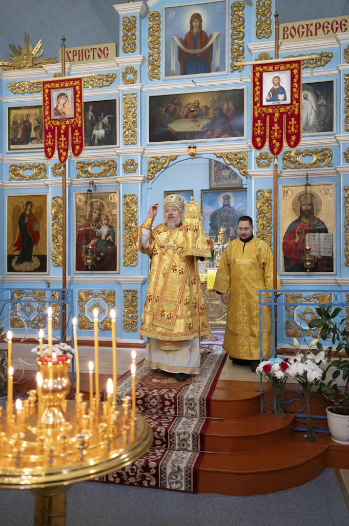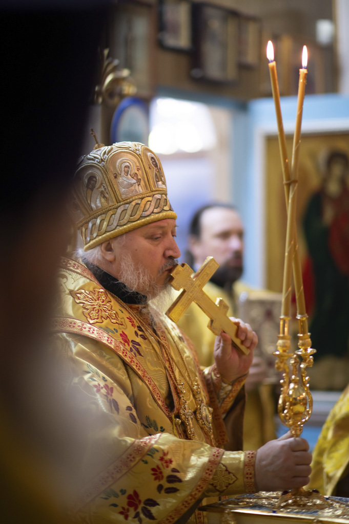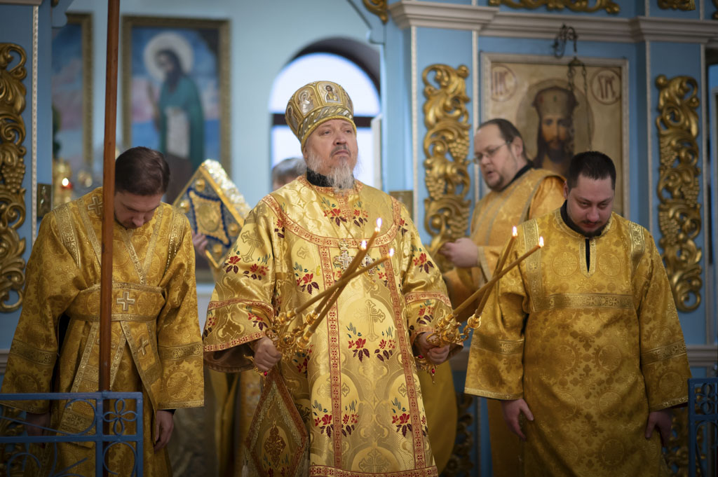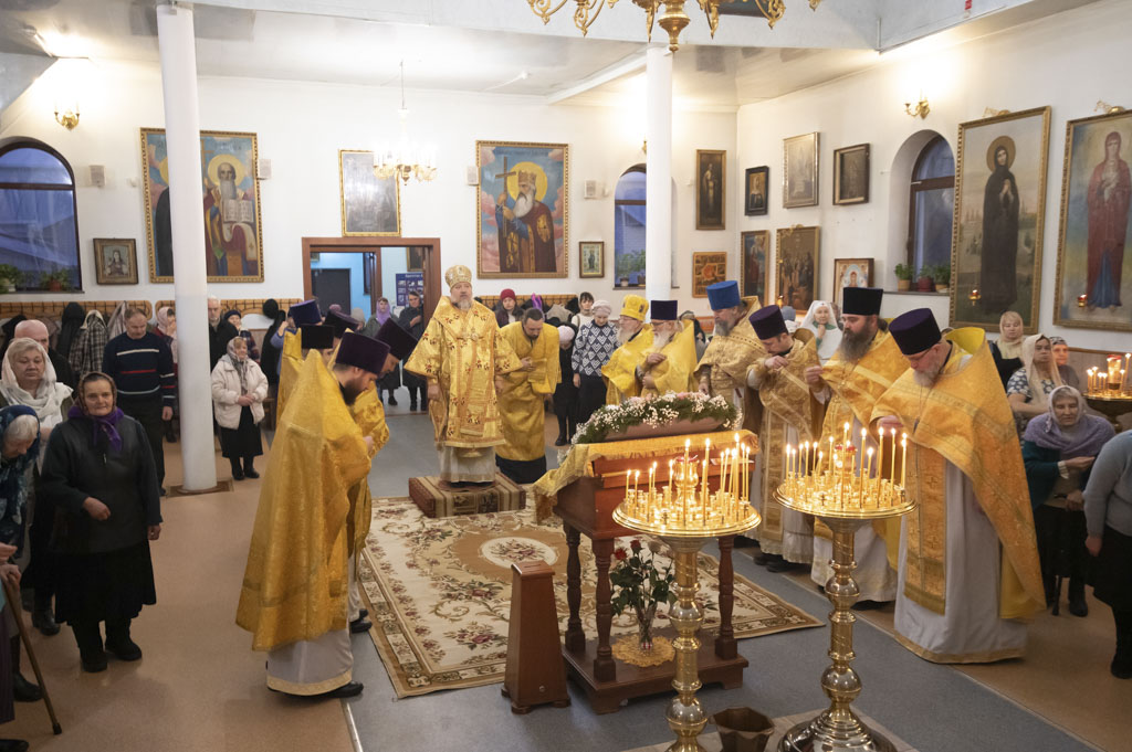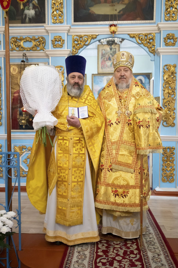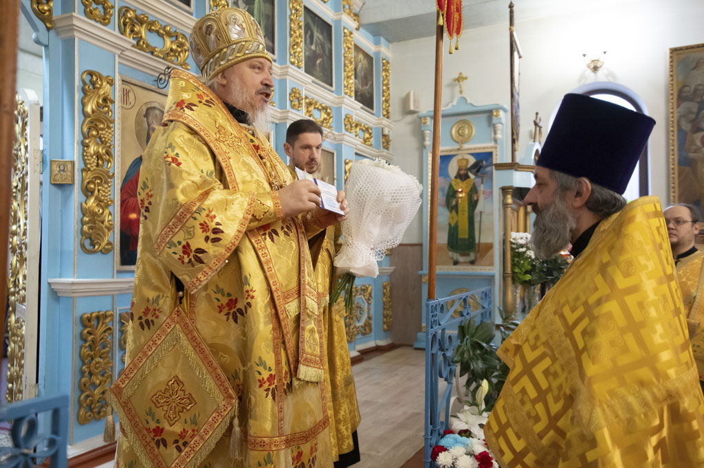 По окончании литургии владыка Стефан поздравил причастников с принятием Святых Христовых Таин и обратился к пастве с архипастырским словом. Особое поздравление прозвучало в адрес настоятеля прихода протоиерея Николая Ефименко, отметившего 60-летие. За усердное служение Церкви отец Николай был удостоен медали святого праведного Иоанна Кормянского. Владыка пожелал юбиляру крепости сил и неокудевающей помощи Божией в дальнейшем пастырском труде.