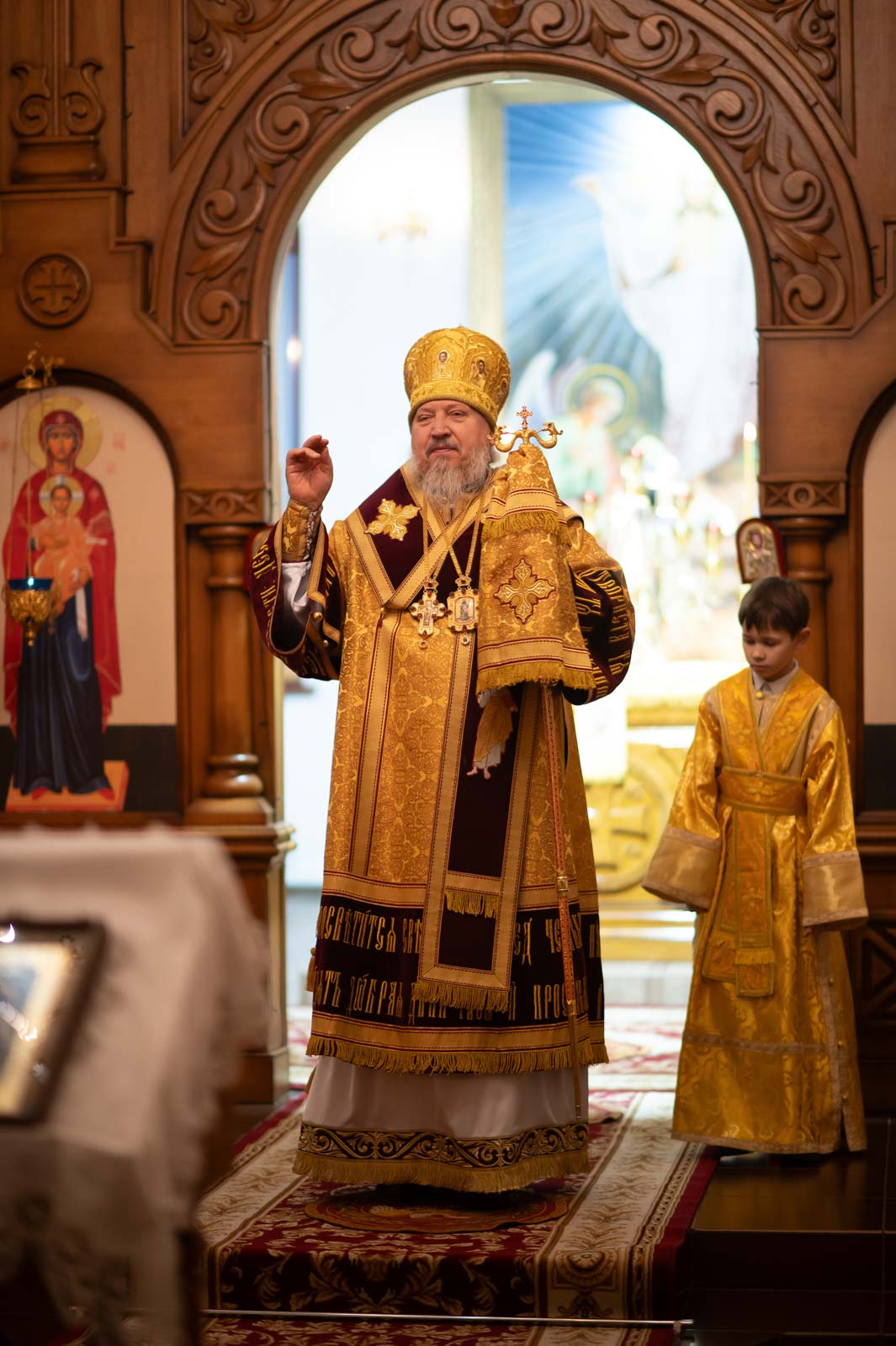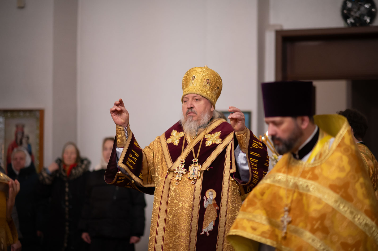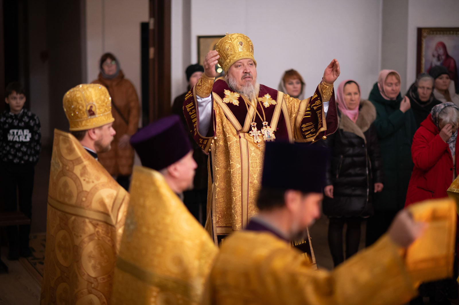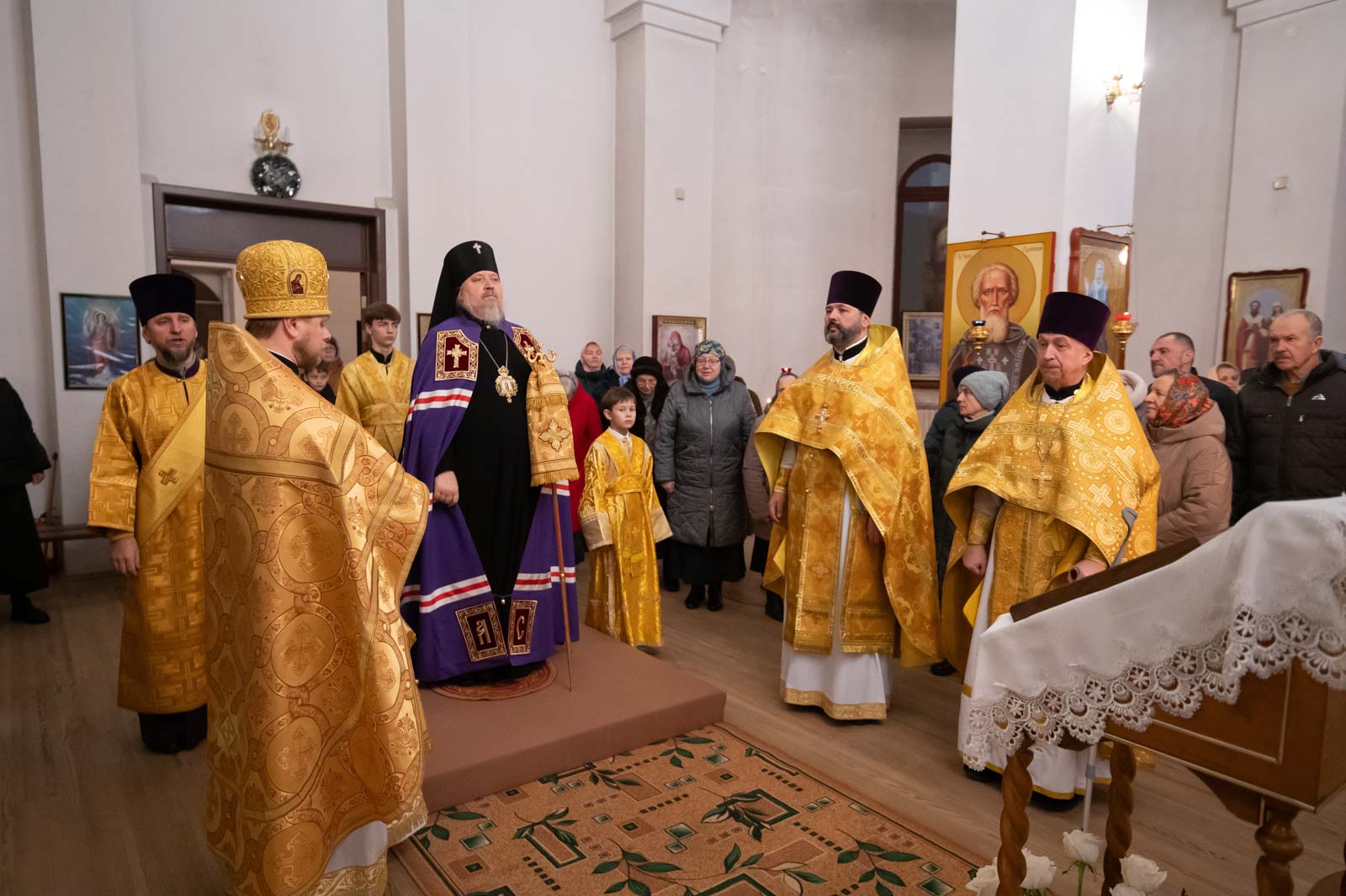 Божественную литургию 21 декабря 2025 года, в Неделю 28-ю по Пятидесятнице, Высокопреосвященнейший Стефан, архиепископ Гомельский и Жлобинский, совершил в приходе храма Казанской иконы Божией Матери в аг. Мичуринская.