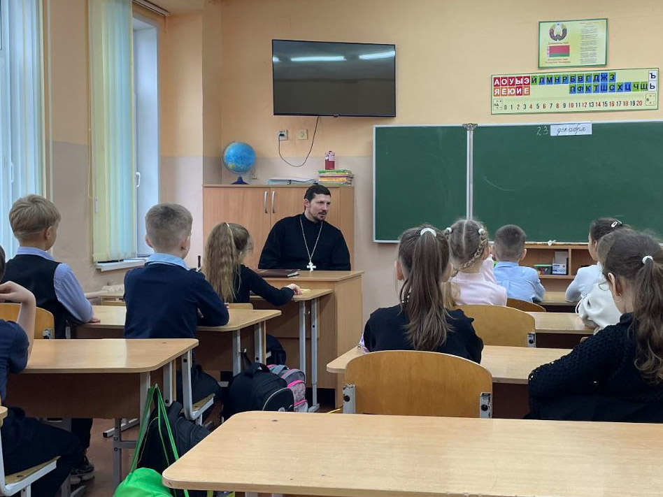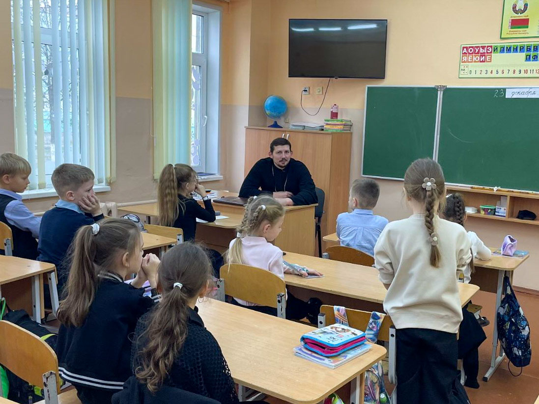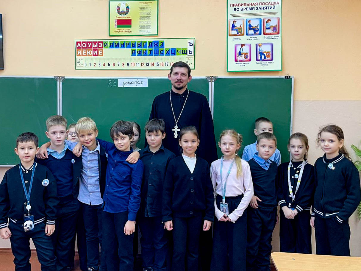 Занятие факультатива по основам православной культуры в средней школе №12 города Жлобина 23 декабря посетил клирик прихода храма святителя Василия Великого иерей Андрей Исаев.  Дети узнали о событиях, которые были связаны с приходом в мир Спасителя. О Рождении Господа в яслях в пещере, явлении пастухам ангелов, прославлявших явившегося в мир Бога, приходе волхвов, которые увидели чудную звезду и отправились поклониться родившемуся в мире Царю.