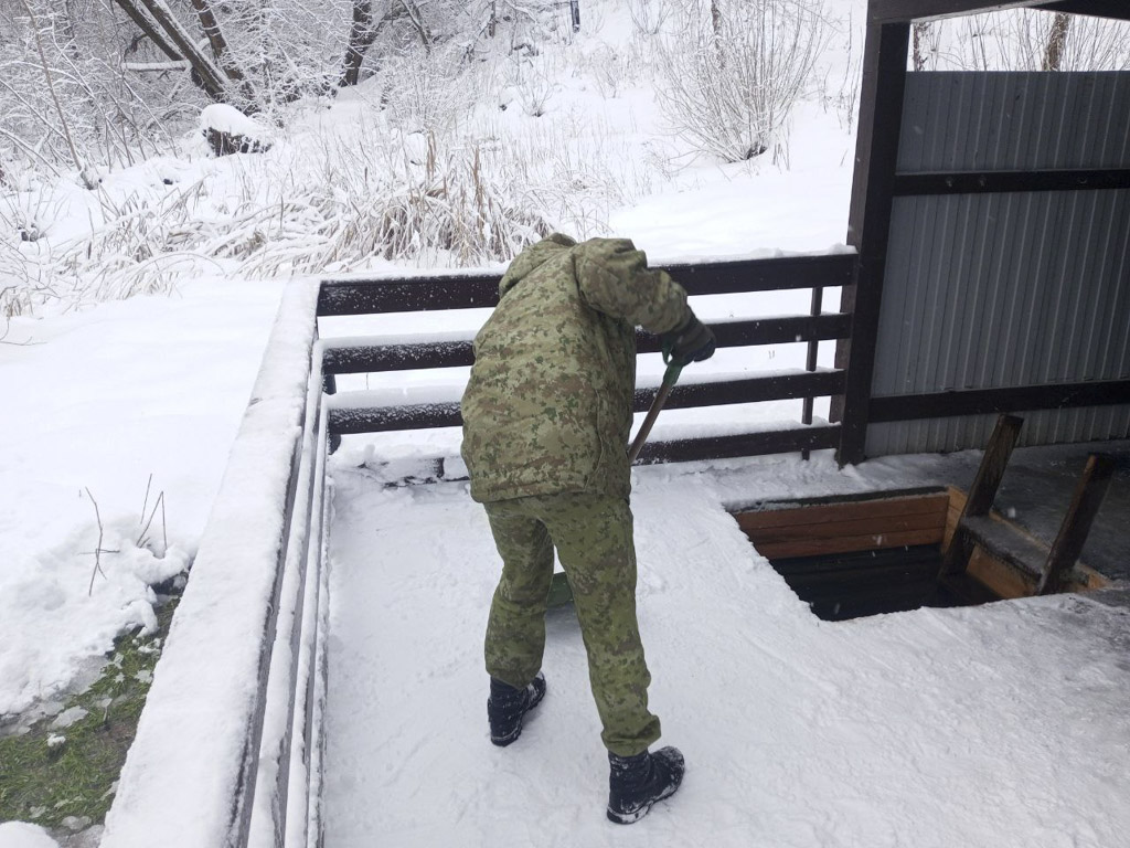 К расчистке территории подключились военнослужащие Гомельской пограничной группы. Пограничники привели в порядок пешеходные тропы, лестничные марши и площадку перед купелью. Для защитников рубежей этот труд стал вкладом в сохранение святыни и заботой о ближних.