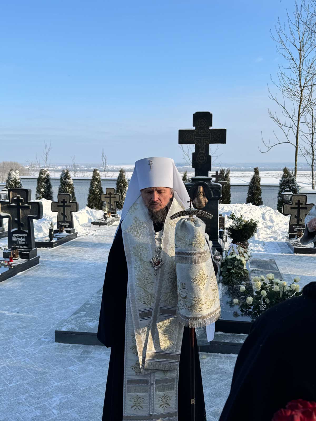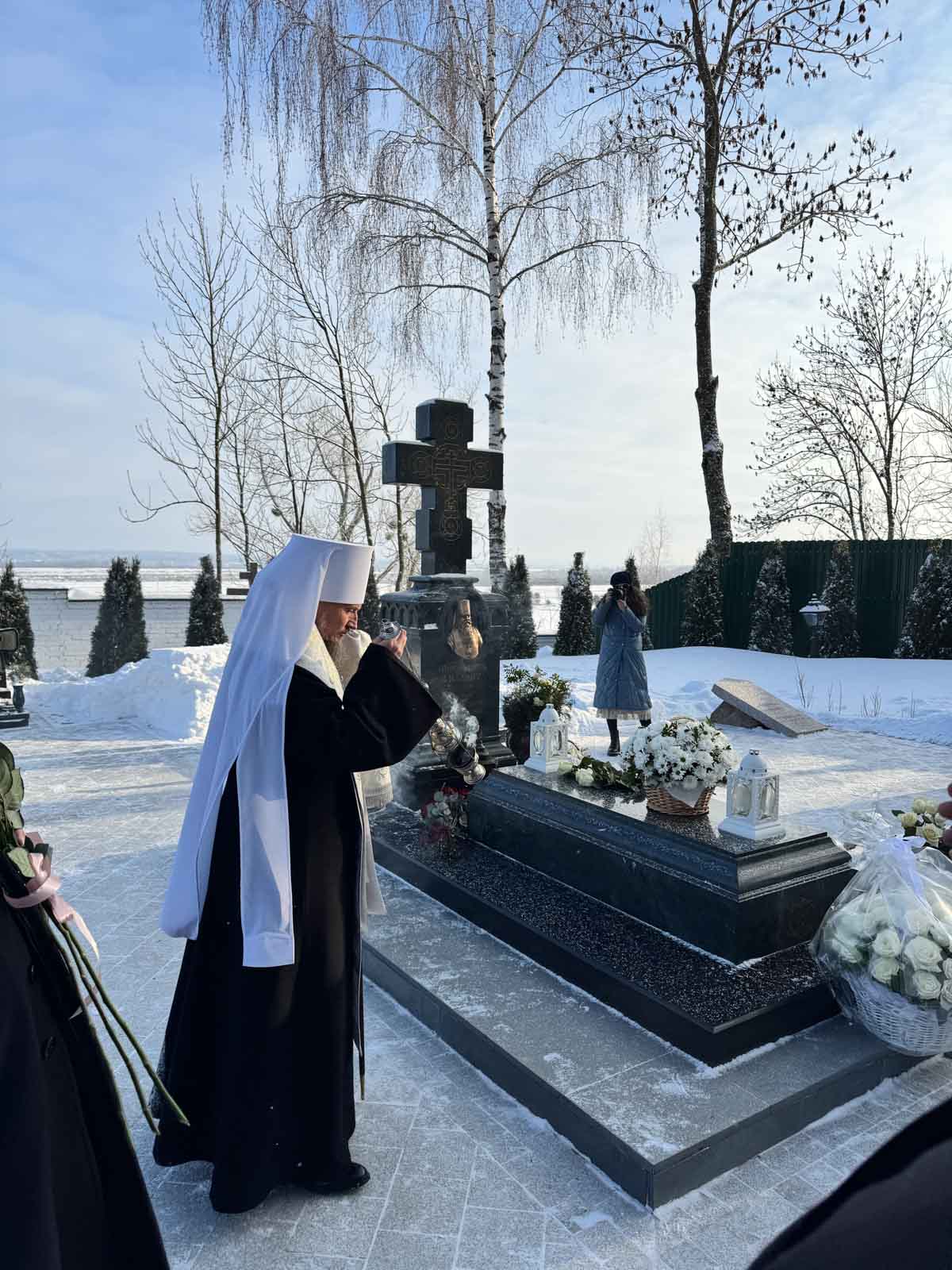 Затем на месте погребения Митрополита Филарета за Крестовоздвиженским храмом Его Высокопреосвященство совершил заупокойную литию.