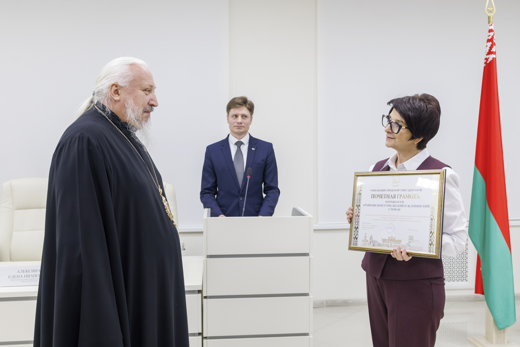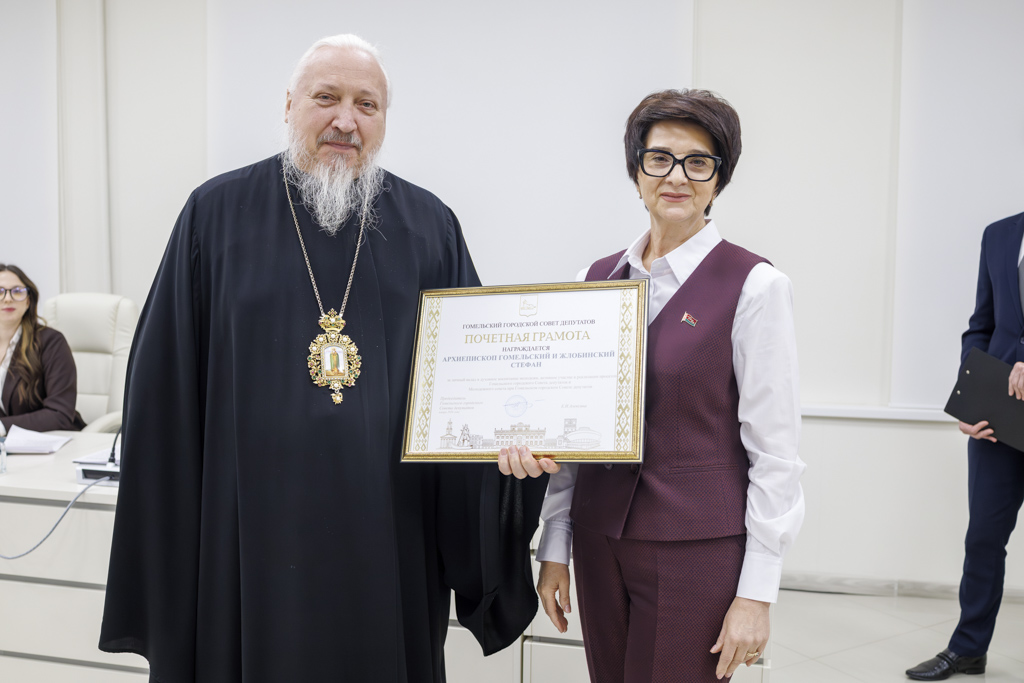 В работе заседания принял участие Высокопреосвященнейший Стефан, архиепископ Гомельский и Жлобинский. Председатель Гомельского городского Совета депутатов Елена Алексина вручила владыке Стефану Почетную грамоту. Этой высокой наградой был отмечен архипастырский вклад в реализацию совместных социально значимых проектов, активное соработничество с органами местной власти и постоянное попечение о духовном становлении молодежи региона.