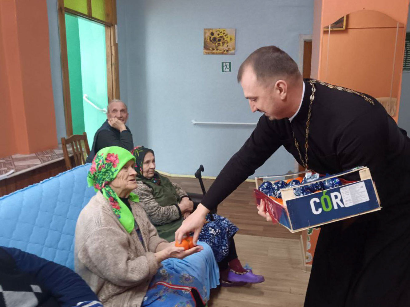 Завершая встречу, батюшка вручил каждому сочные мандарины, а также передал сотрудникам ТЦСОН необходимые средства гигиены для ежедневного ухода за подопечными.