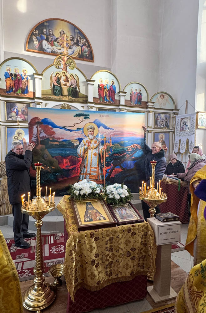 По заамвонной молитве было совершено славление святому равноапостольному Николаю, архиепископу Японскому и чин освящения надвратной иконы для размещения ее на фасаде храма.