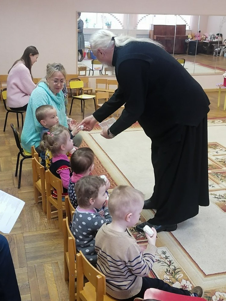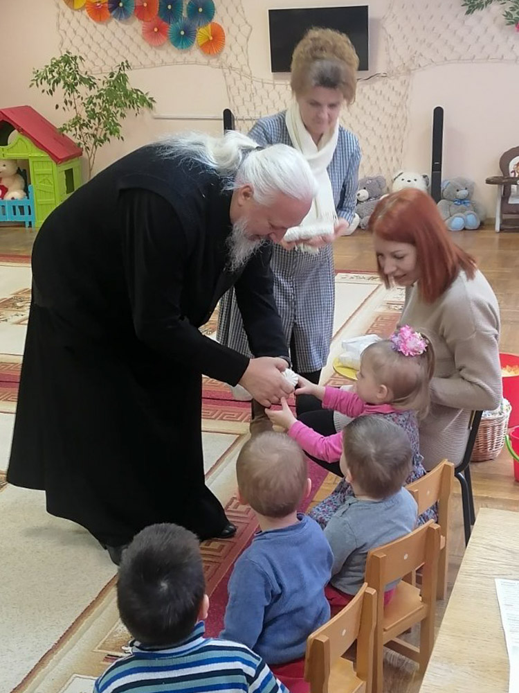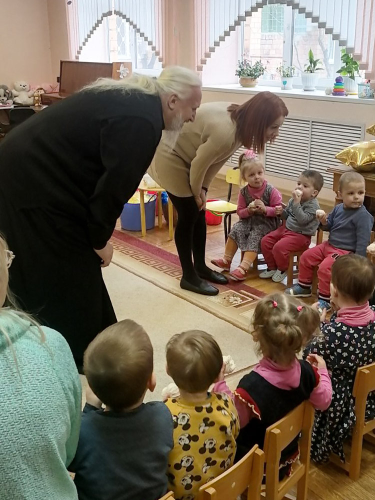 Во время посещения сотрудники учреждения и дети собрались в музыкальном зале. Владыка побеседовал с воспитанниками, благословил их, а также передал фрукты, соки и сладкие угощения.