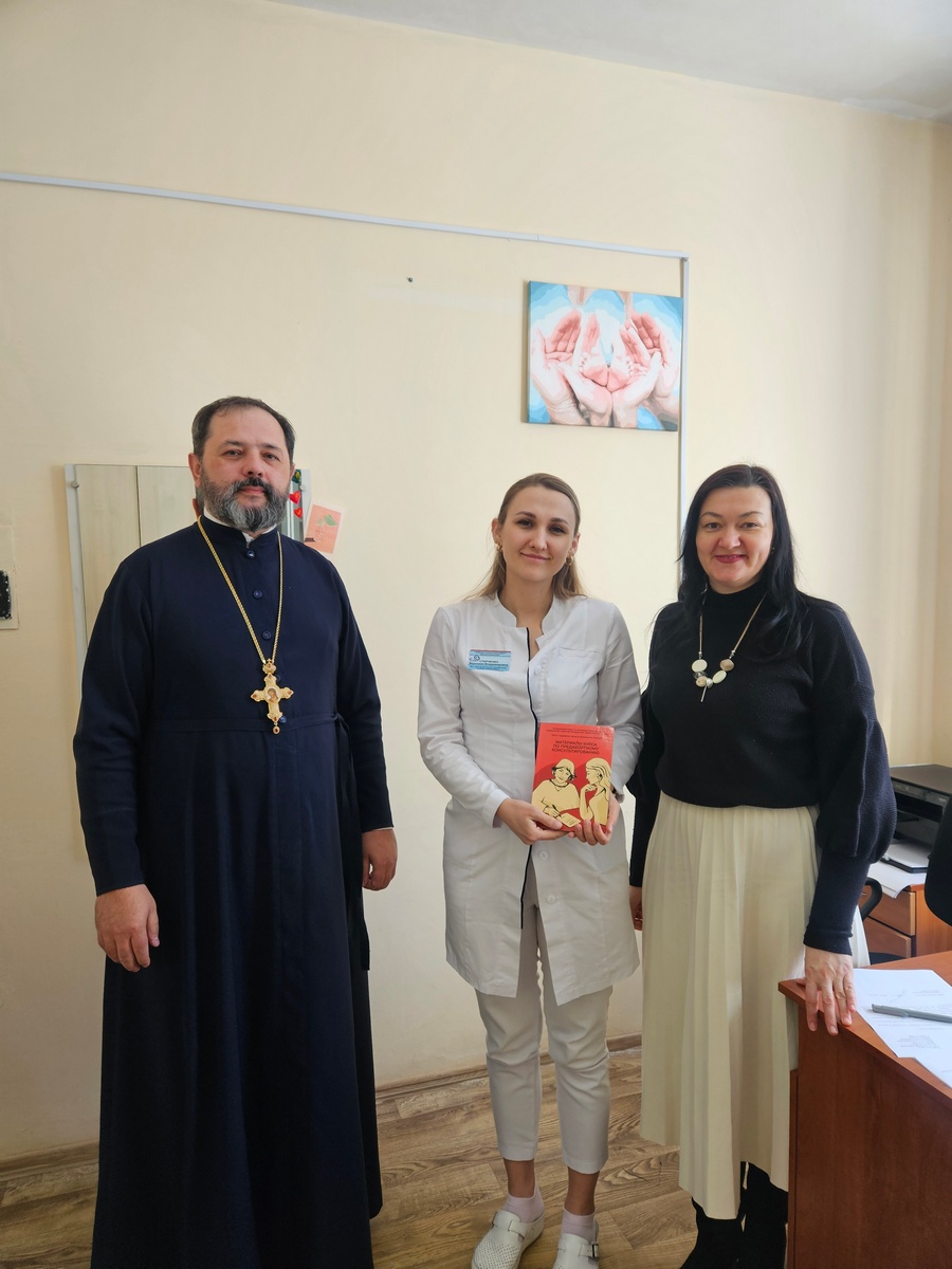 4 марта 2026 года в Гомельской городской поликлинике № 1 состоялась рабочая встреча председателя отдела по вопросам семьи, защиты материнства и детства Гомельской епархии протоиерея Артемия Кривицкого и координатора отдела Кривицкой Ольги Анатольевны с заведующей женской консультацией Старченко Вероникой Владимировной.