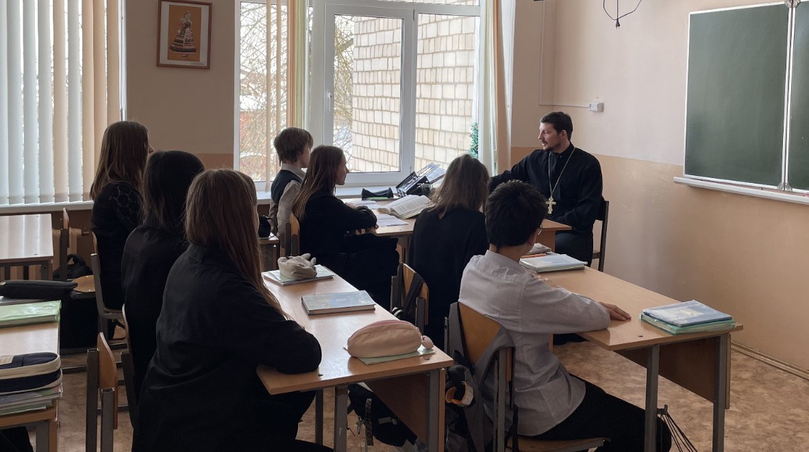 В преддверии Дня православной книги, который ежегодно отмечается 14 марта, клирик храма святителя Василия Великого в г.Жлобине иерей Андрей Исаев встретился с учащимися средних школ №9 и №11 г.Жлобина.