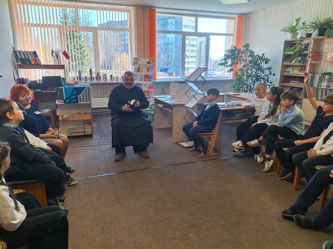 12 марта 2026 года в школьной библиотеке ГУО «Гимназия №71 г. Гомеля» состоялась встреча настоятеля прихода храма Скитковской иконы Божией Матери в г. Гомеле протоиерея Максима Колеватова с учащимися 4 класса, посвящённая Дню православной книги.