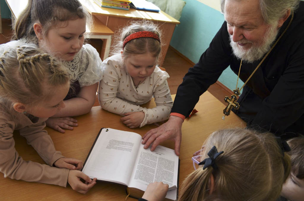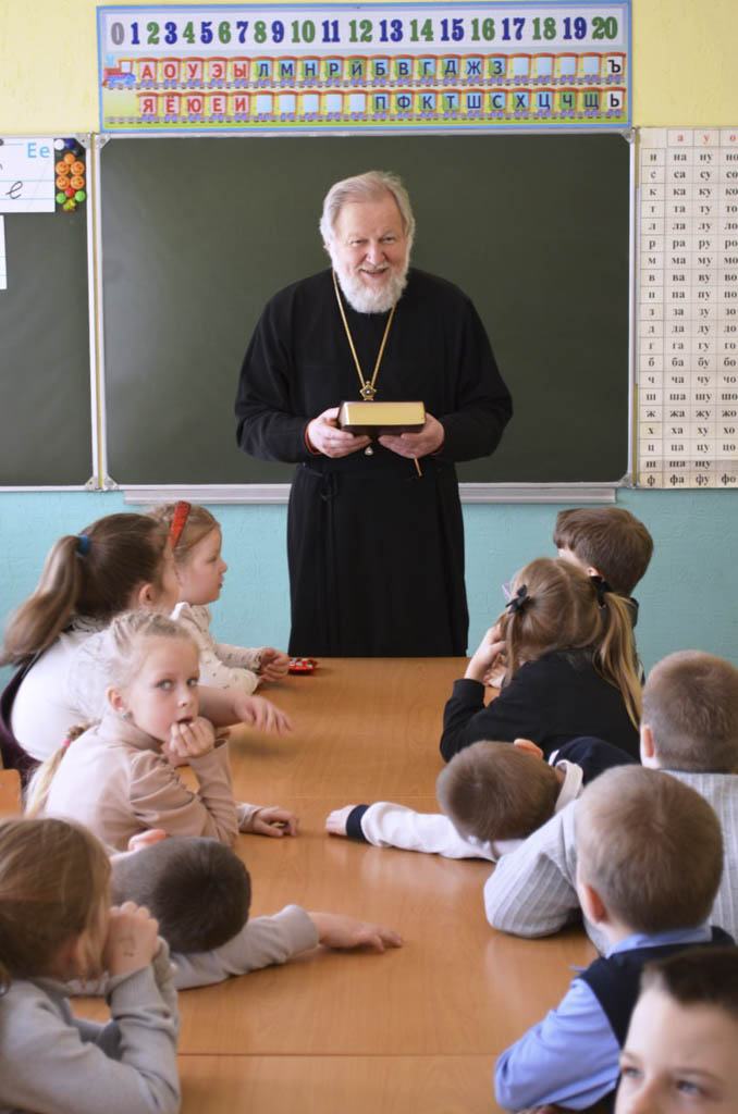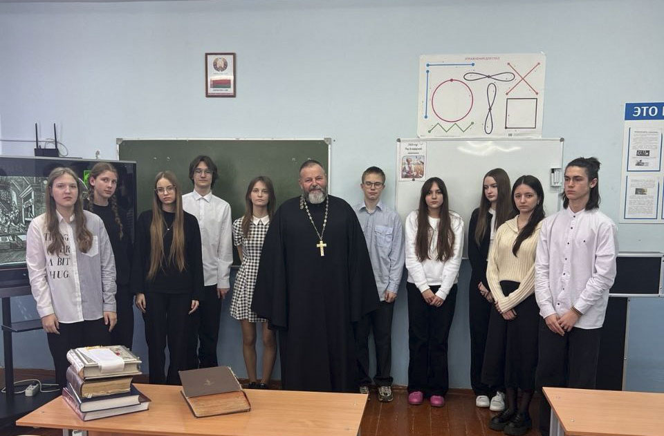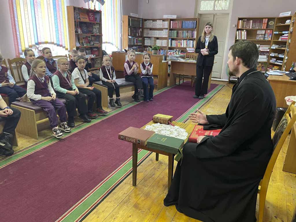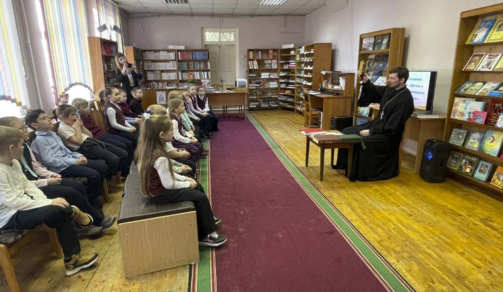 Разговор шёл о духовности и книге. Священник рассказал ребятам познавательную историю о том, как церковные деятели веками несли книжную культуру в народ. Школьники узнали, что первопечатник Иван Фёдоров, будучи диаконом кремлёвского храма, не просто издал первую на Руси печатную книгу «Апостол» в 1564 году, но и снабдил её предисловием, объясняя простым людям, почему чтение важно для души. А в XVIII веке святитель Тихон Задонский специально писал небольшие книжки и листовки понятным языком и бесплатно раздавал их крестьянам и мещанам на ярмарках. Будучи уже известным богословом, он мог бы писать только для учёных мужей, но выбрал путь просвещения обычного народа, считая, что книга — такая же духовная пища, как и молитва.