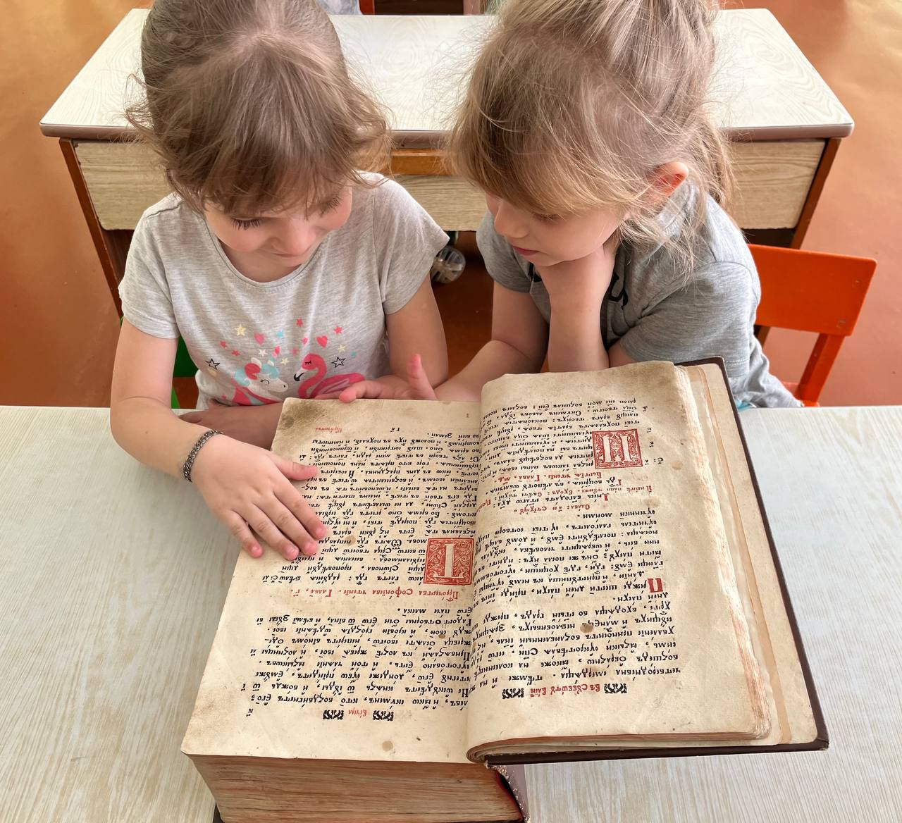 Священник предложил ребятам рассмотреть и прочитать текст на церковнославянском языке, что вызвало неподдельный интерес.