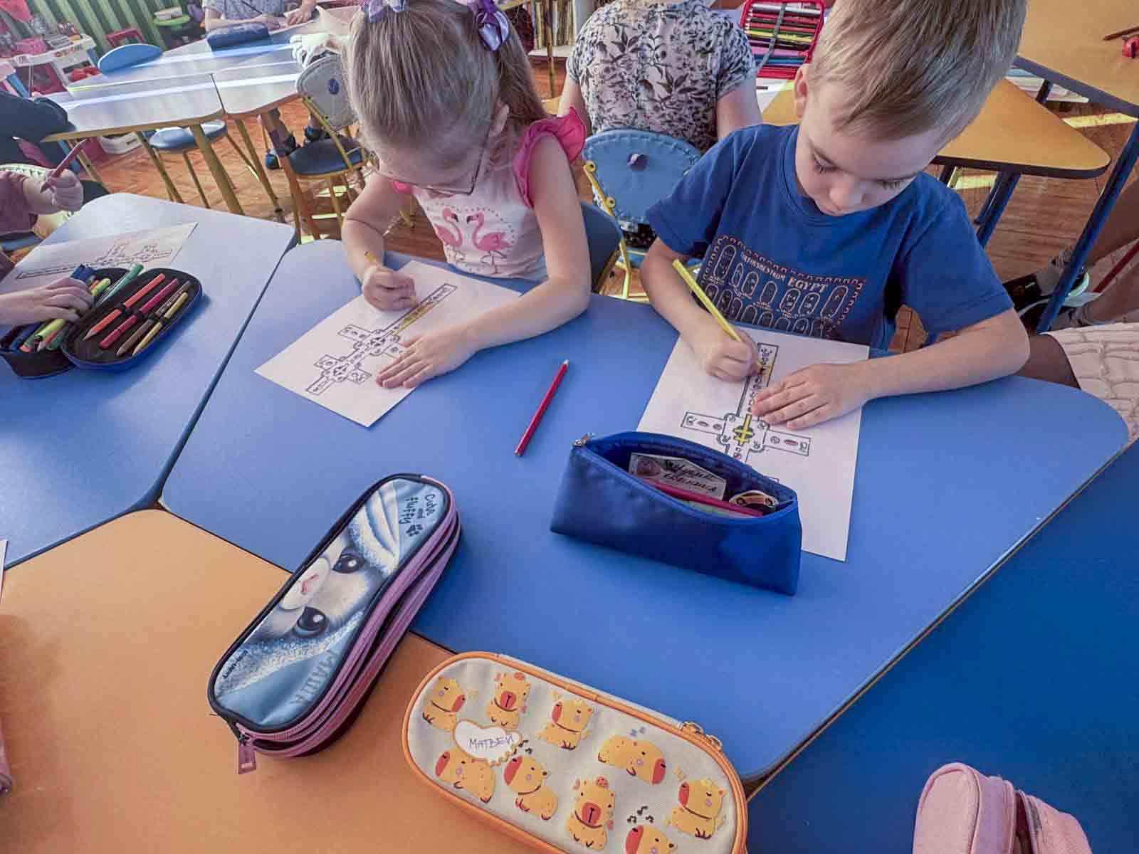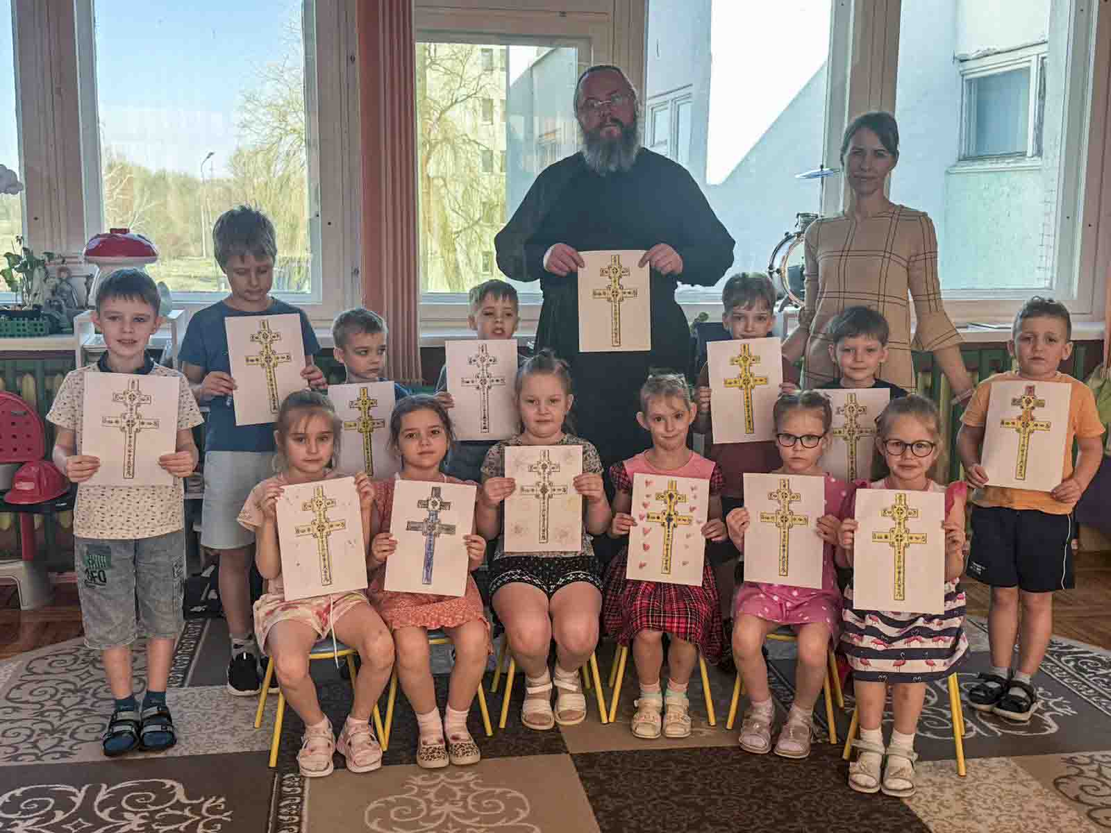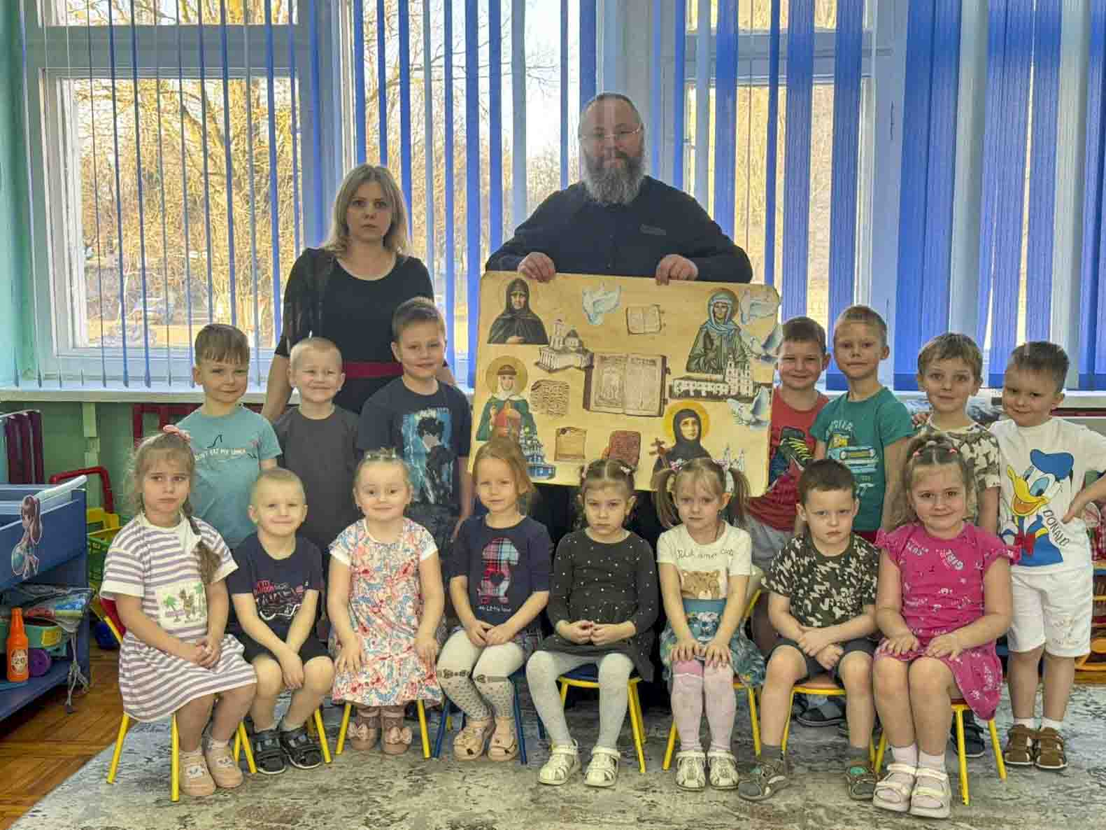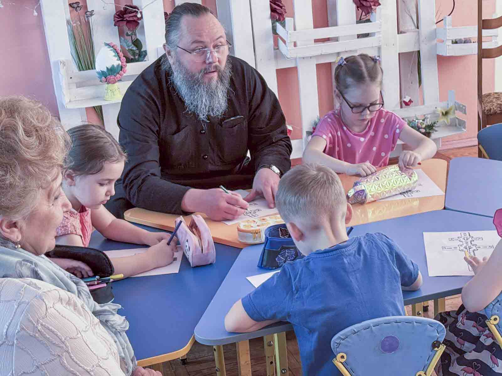 В рамках образовательной программы клирик Свято-Никольского мужского монастыря диакон Павел Шелудяков разделил с воспитанниками труды по созданию тематических работ. Дети средней группы подготовили коллективную страницу книги «Святые заступницы земли белорусской», а воспитанники старшей группы посвятили время художественному осмыслению образа Креста преподобной Евфросинии Полоцкой. Совместное делание священнослужителя и детей стало видимым образом передачи духовного опыта и послушания.