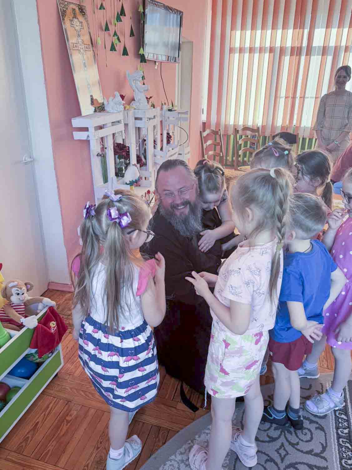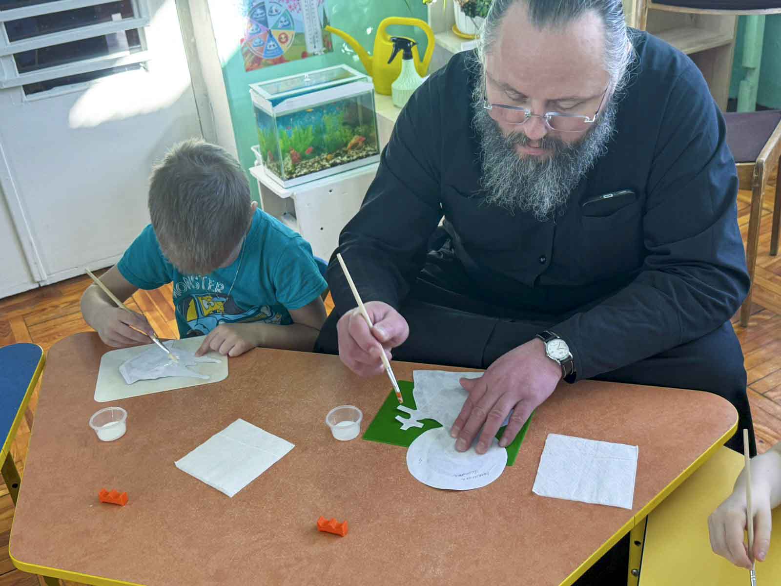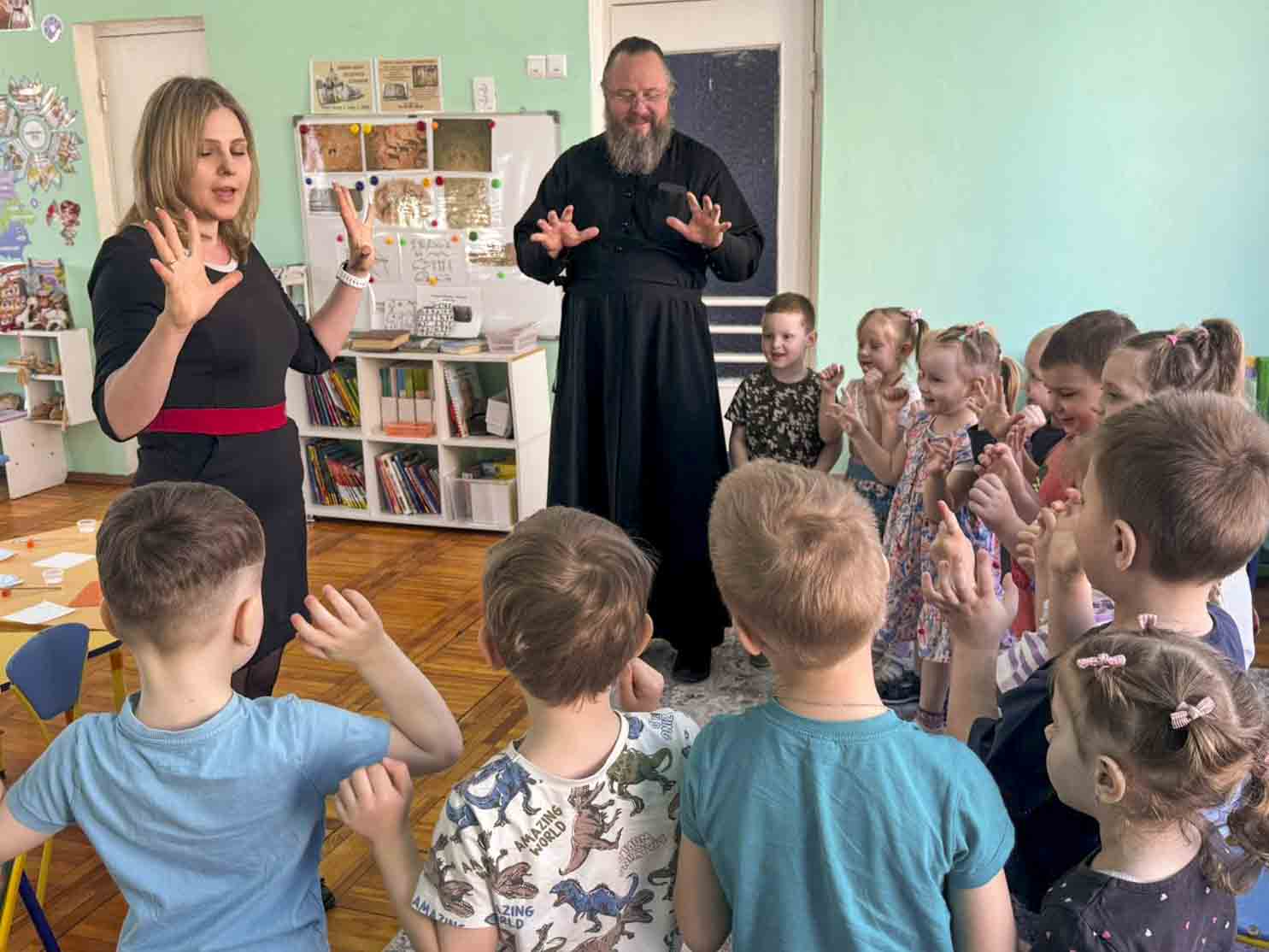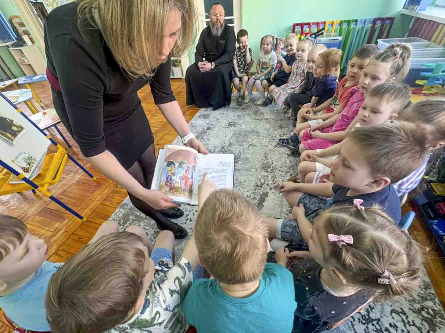 В рамках образовательной программы клирик Свято-Никольского мужского монастыря диакон Павел Шелудяков разделил с воспитанниками труды по созданию тематических работ. Дети средней группы подготовили коллективную страницу книги «Святые заступницы земли белорусской», а воспитанники старшей группы посвятили время художественному осмыслению образа Креста преподобной Евфросинии Полоцкой. Совместное делание священнослужителя и детей стало видимым образом передачи духовного опыта и послушания.