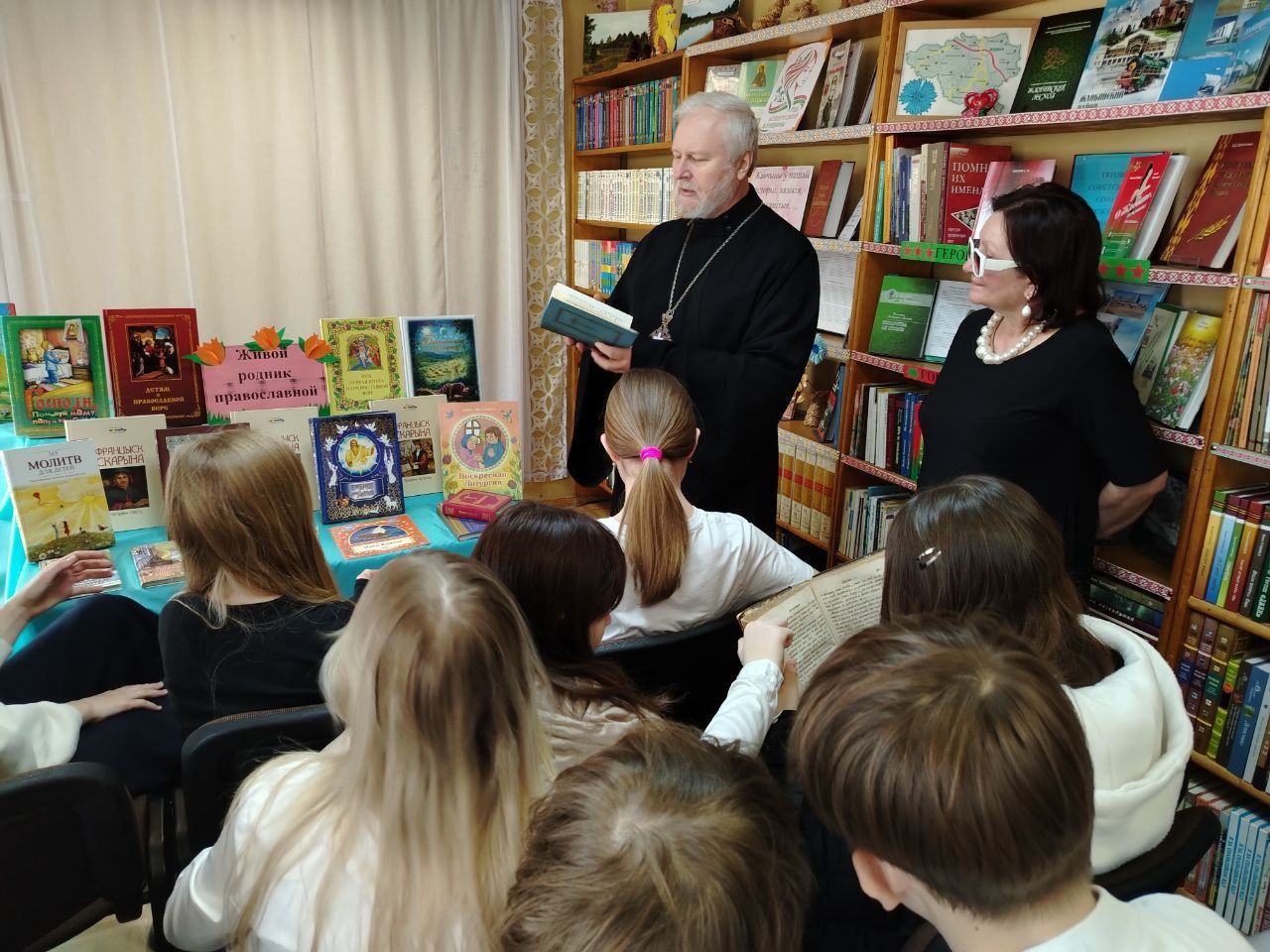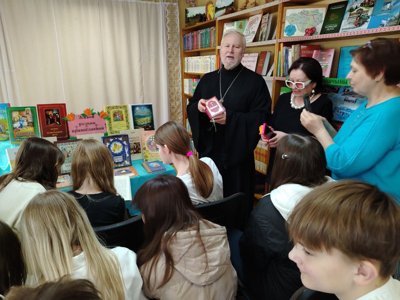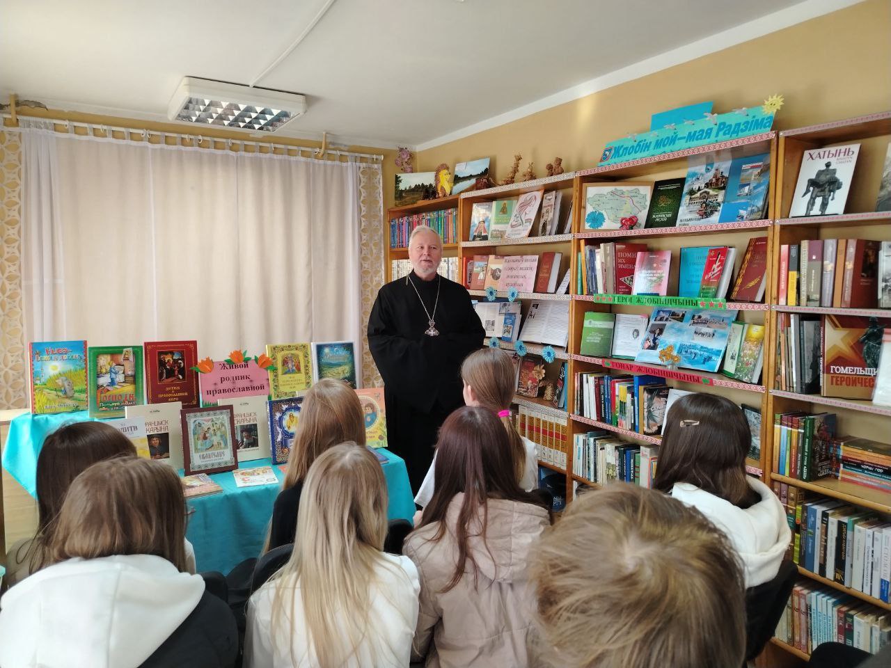 17 марта в городской детской библиотеке-филиале №3 города Жлобина клирик прихода храма Святой Живоначальной Троицы протоиерей Павел Бондарчук провел беседу «Живой родник православной книги» с учащимися 7 класса средней школы №10.