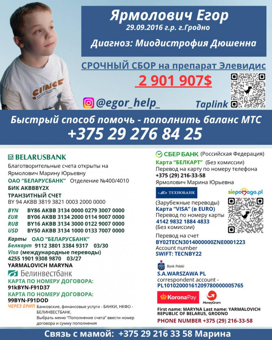 У Егора диагностировано редкое генетическое заболевание — Миодистрофия Дюшенна. Единственный препарат, который может спасти его жизнь, Elevidys, стоимостью $ 2 901 907.