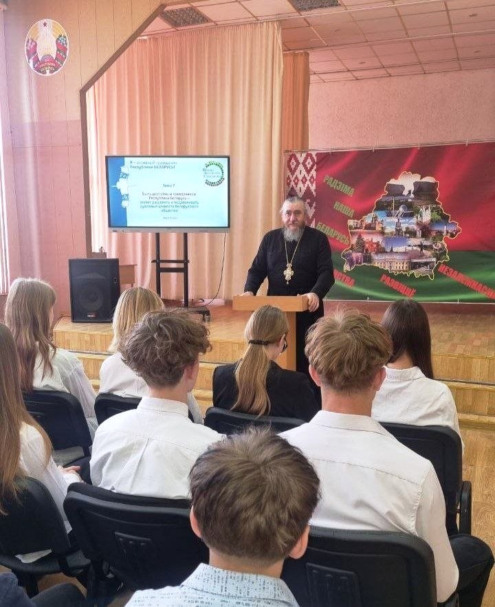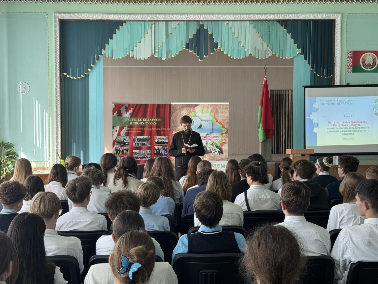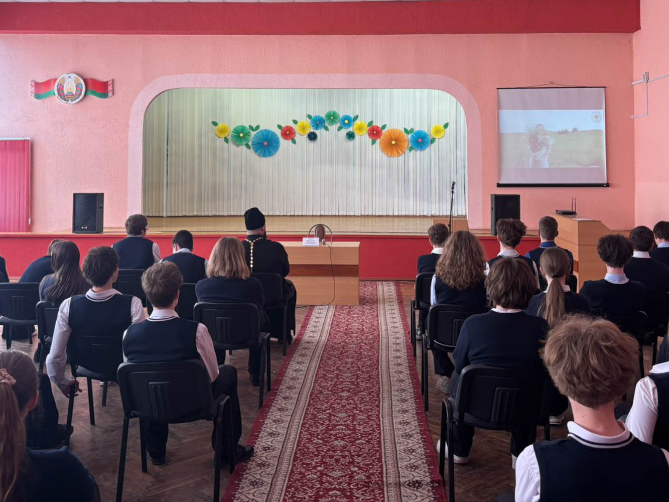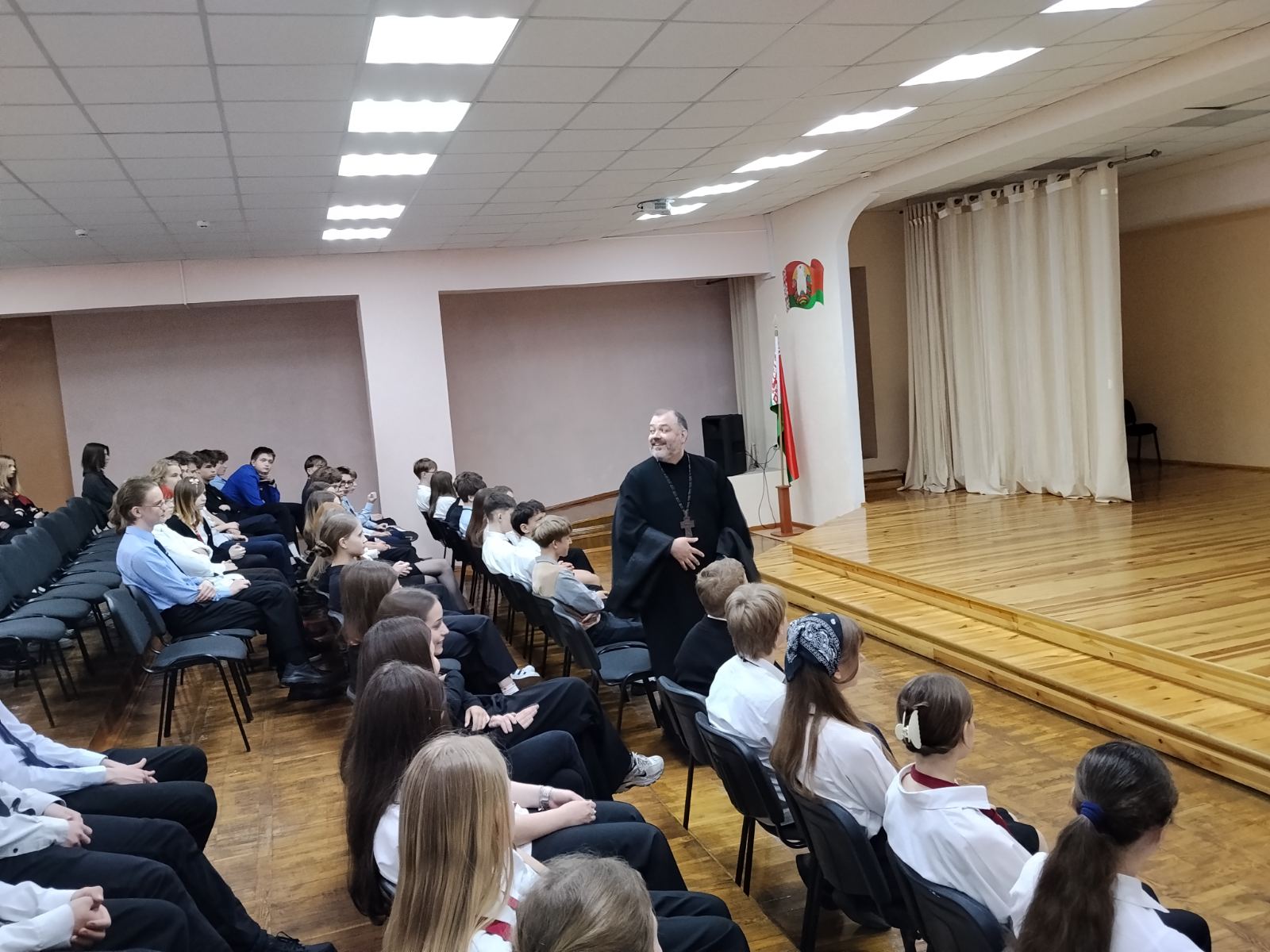 Продолжая разговор, учащиеся вместе со священнослужителем размышляли о духовных ценностях, о нравственных основаниях жизни, о верности традициям народа и о том, как эти ориентиры воплощаются в повседневных поступках человека. Разговор был обращён к теме внутренней ответственности, уважения к своей стране, к людям и к духовному наследию Беларуси.