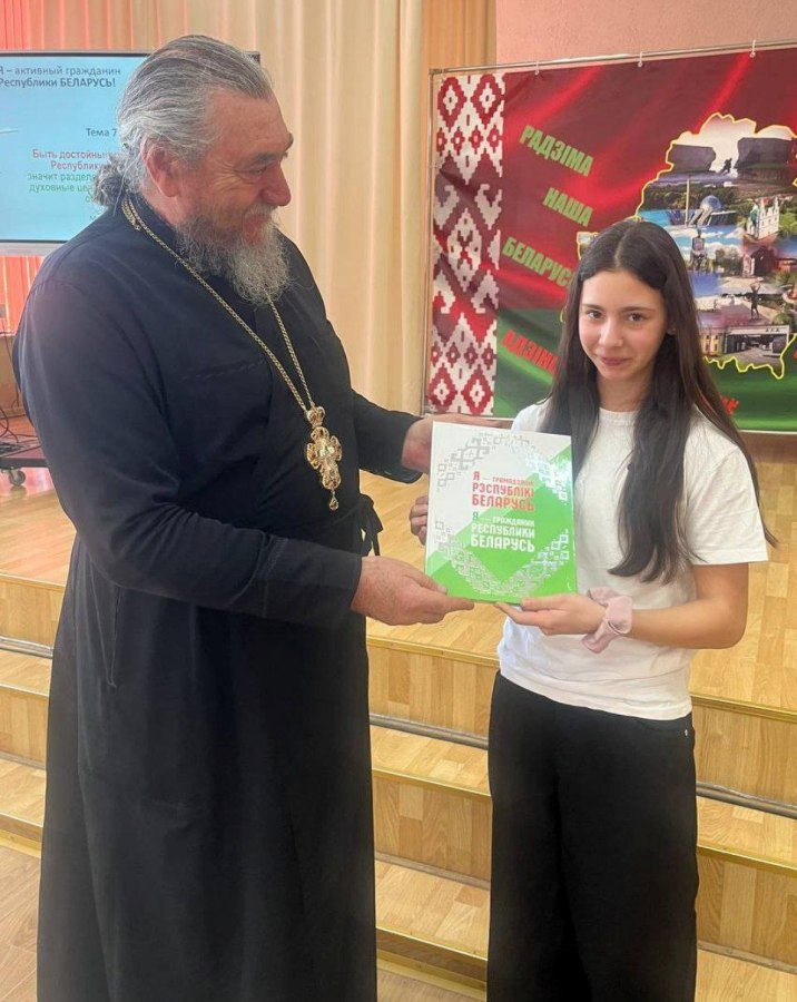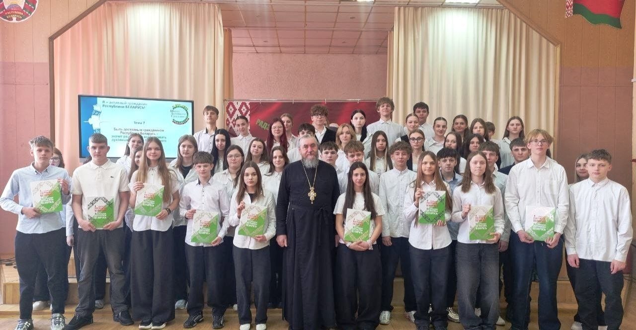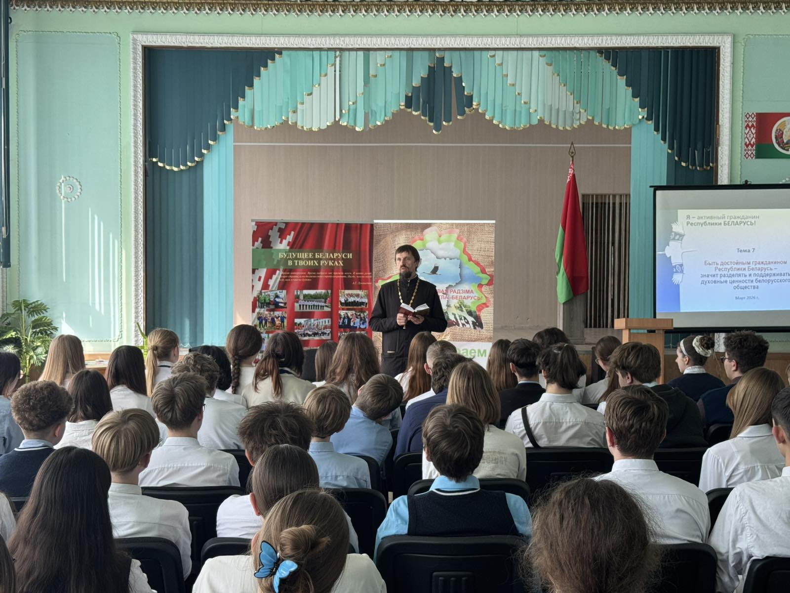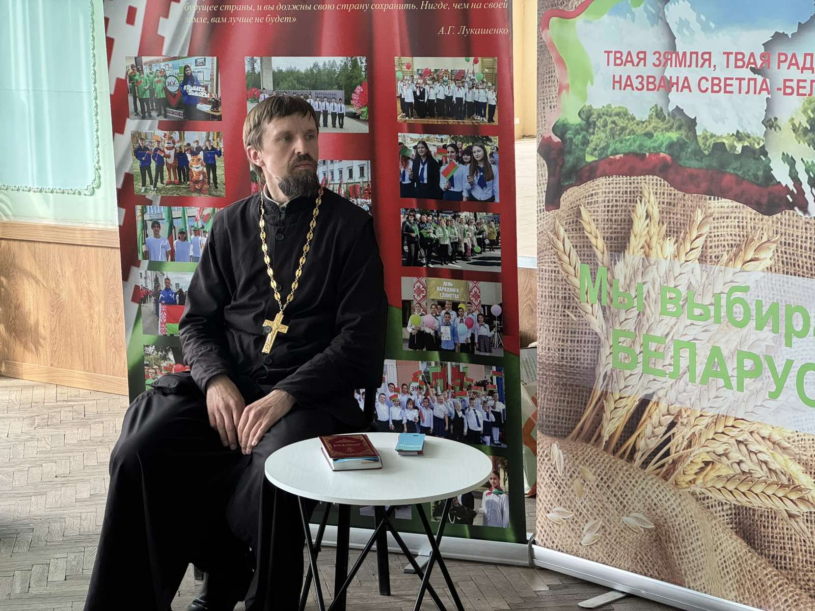 Продолжая разговор, учащиеся вместе со священнослужителем размышляли о духовных ценностях, о нравственных основаниях жизни, о верности традициям народа и о том, как эти ориентиры воплощаются в повседневных поступках человека. Разговор был обращён к теме внутренней ответственности, уважения к своей стране, к людям и к духовному наследию Беларуси.