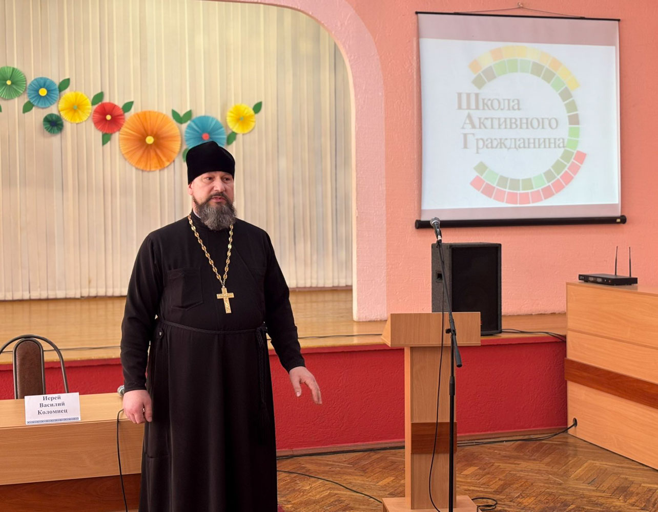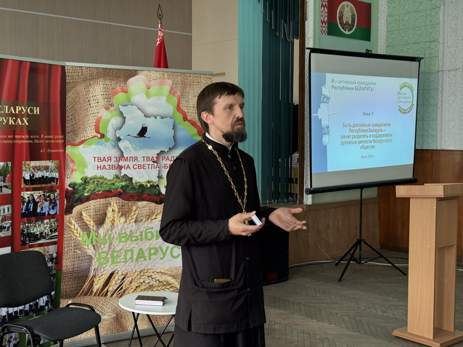 31 марта клирик прихода храма Преображения Господня в городе Гомеле иерей Василий Коломиец провёл урок Школы Активного Гражданина в ГУО «Средняя школа № 27 г. Гомеля» для учащихся 8–11 классов. Беседа была посвящена духовным ценностям, которые помогают человеку сохранять внутреннюю опору, уважение к окружающим и любовь к Отечеству.
