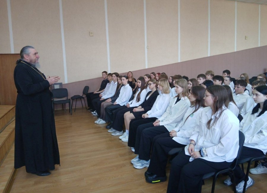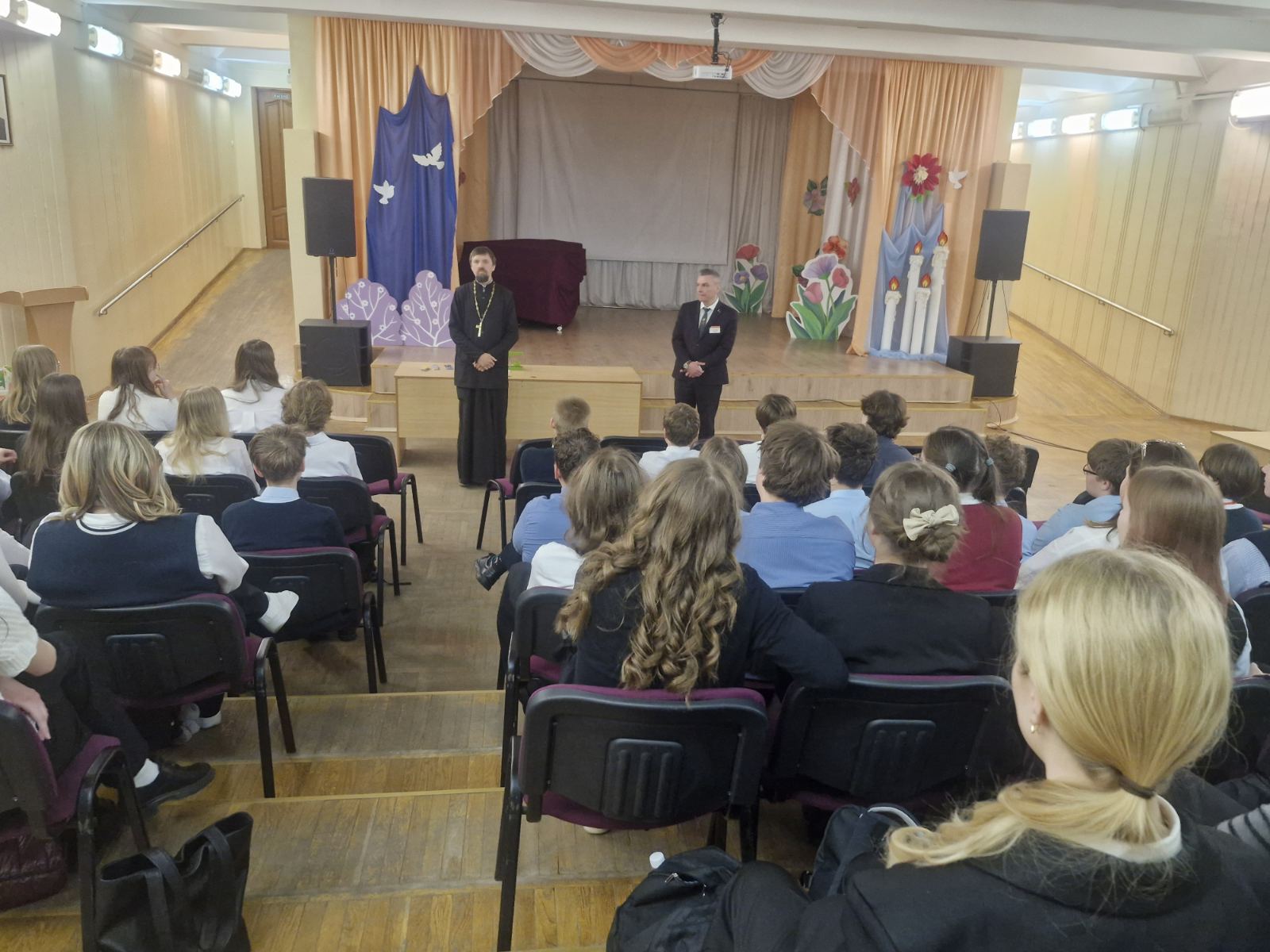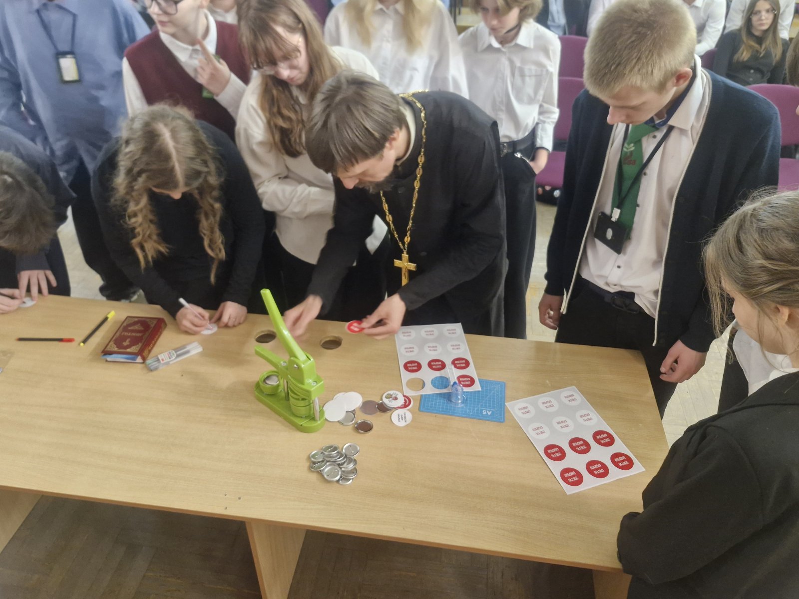 В средней школе № 4 священнослужитель говорил о том, что прочные духовные ценности помогают человеку формировать внутренний стержень, воспитывают ответственность и влияют на его отношение к людям, к своей стране и к собственным поступкам. Общение было построено в интерактивной форме. В завершение состоялся мастер-класс по изготовлению тематических значков, и участники смогли своими руками сделать памятный сувенир.