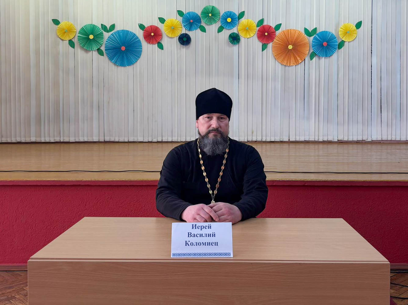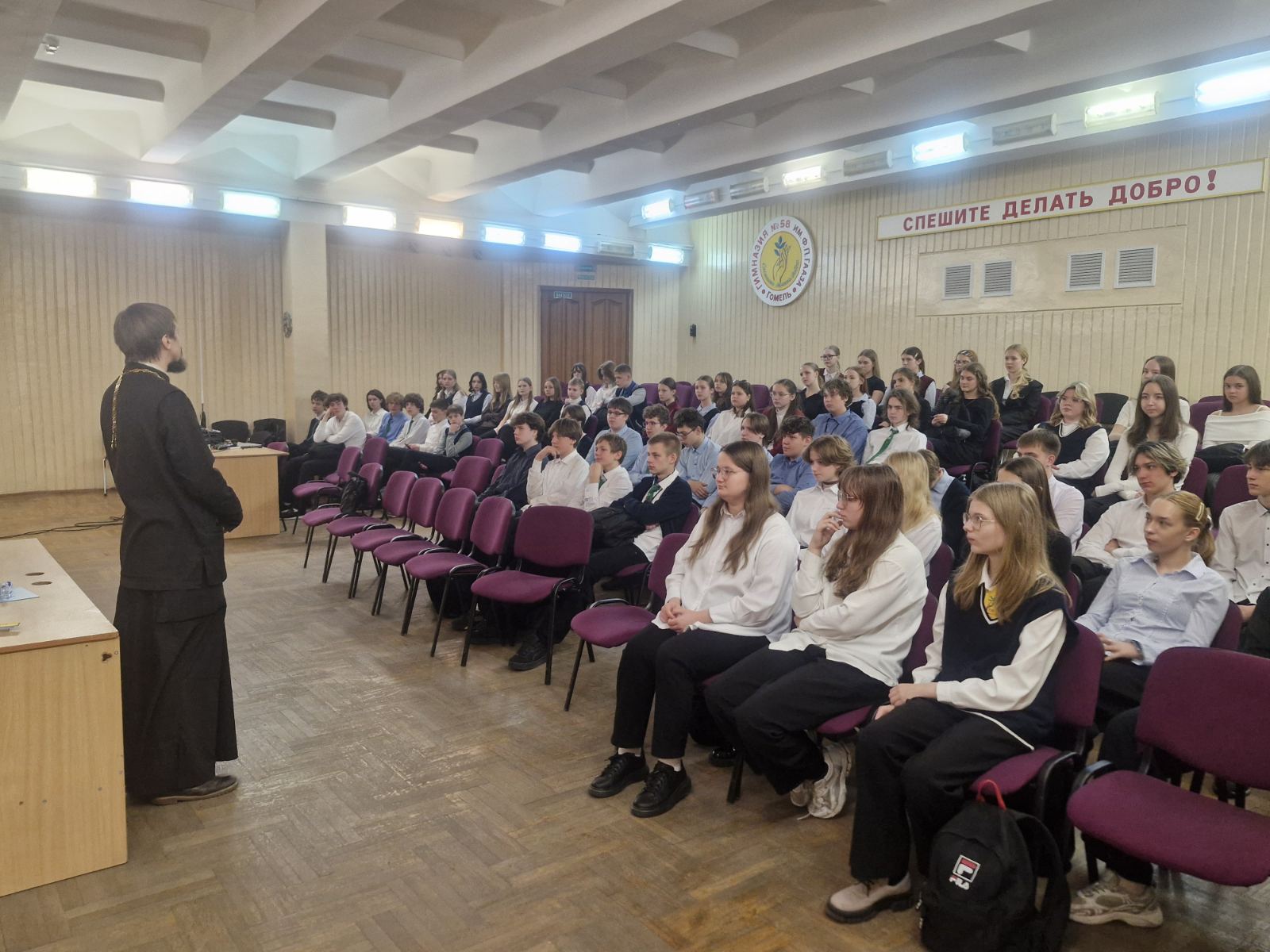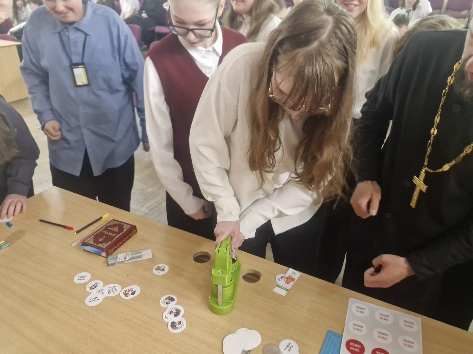 В средней школе № 4 священнослужитель говорил о том, что прочные духовные ценности помогают человеку формировать внутренний стержень, воспитывают ответственность и влияют на его отношение к людям, к своей стране и к собственным поступкам. Общение было построено в интерактивной форме. В завершение состоялся мастер-класс по изготовлению тематических значков, и участники смогли своими руками сделать памятный сувенир.