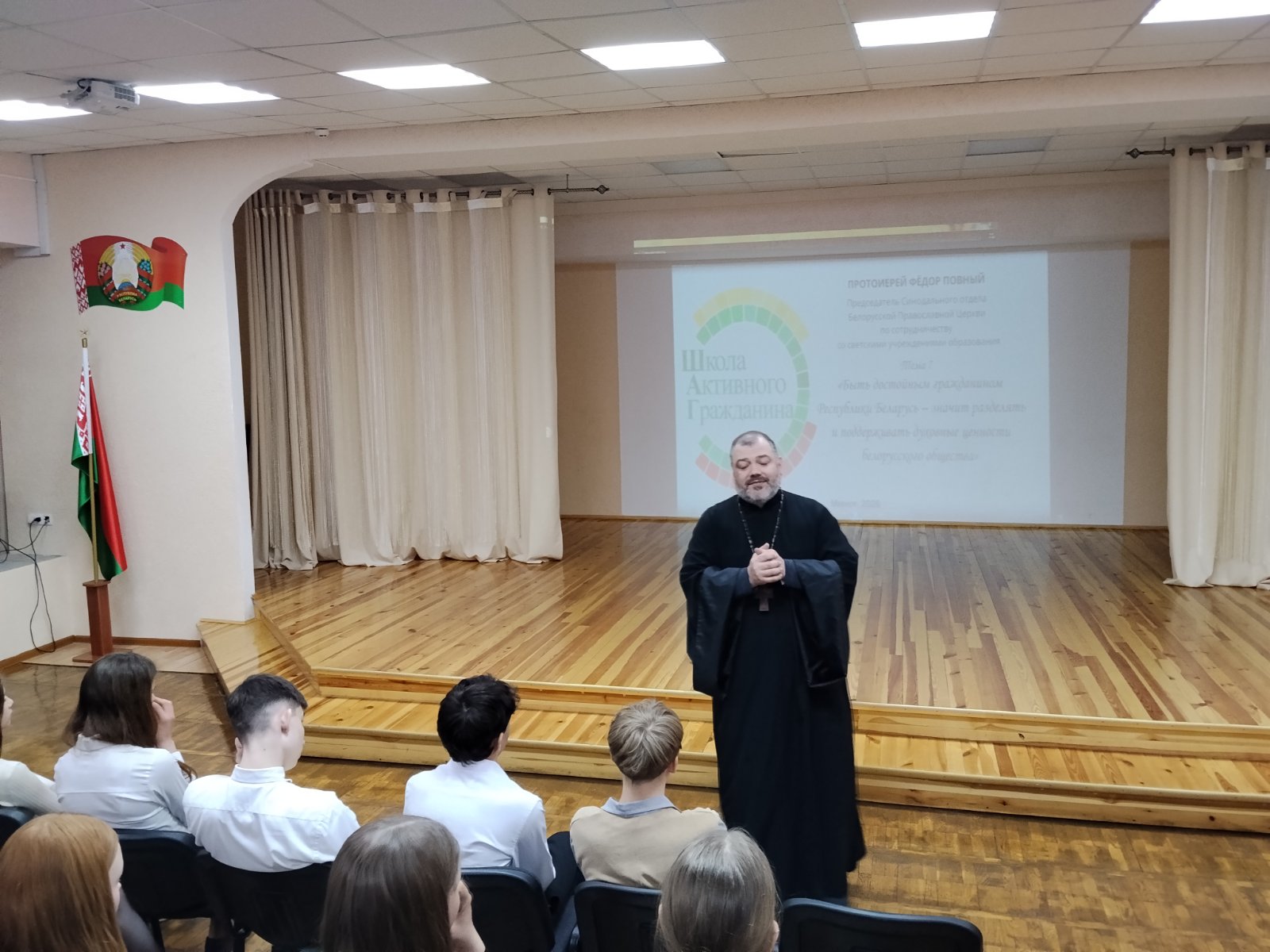 В ГУО «Гимназия № 71 г. Гомеля» урок для учащихся 8–11 классов провёл настоятель прихода храма Скитковской иконы Божией Матери протоиерей Максим Колеватов. В начале встречи вниманию школьников был предложен тематический видеоролик, в котором председатель Синодального отдела Белорусской Православной Церкви по сотрудничеству со светскими учреждениями образования протоиерей Фёдор Повный говорил о качествах, которые определяют активную гражданскую позицию.