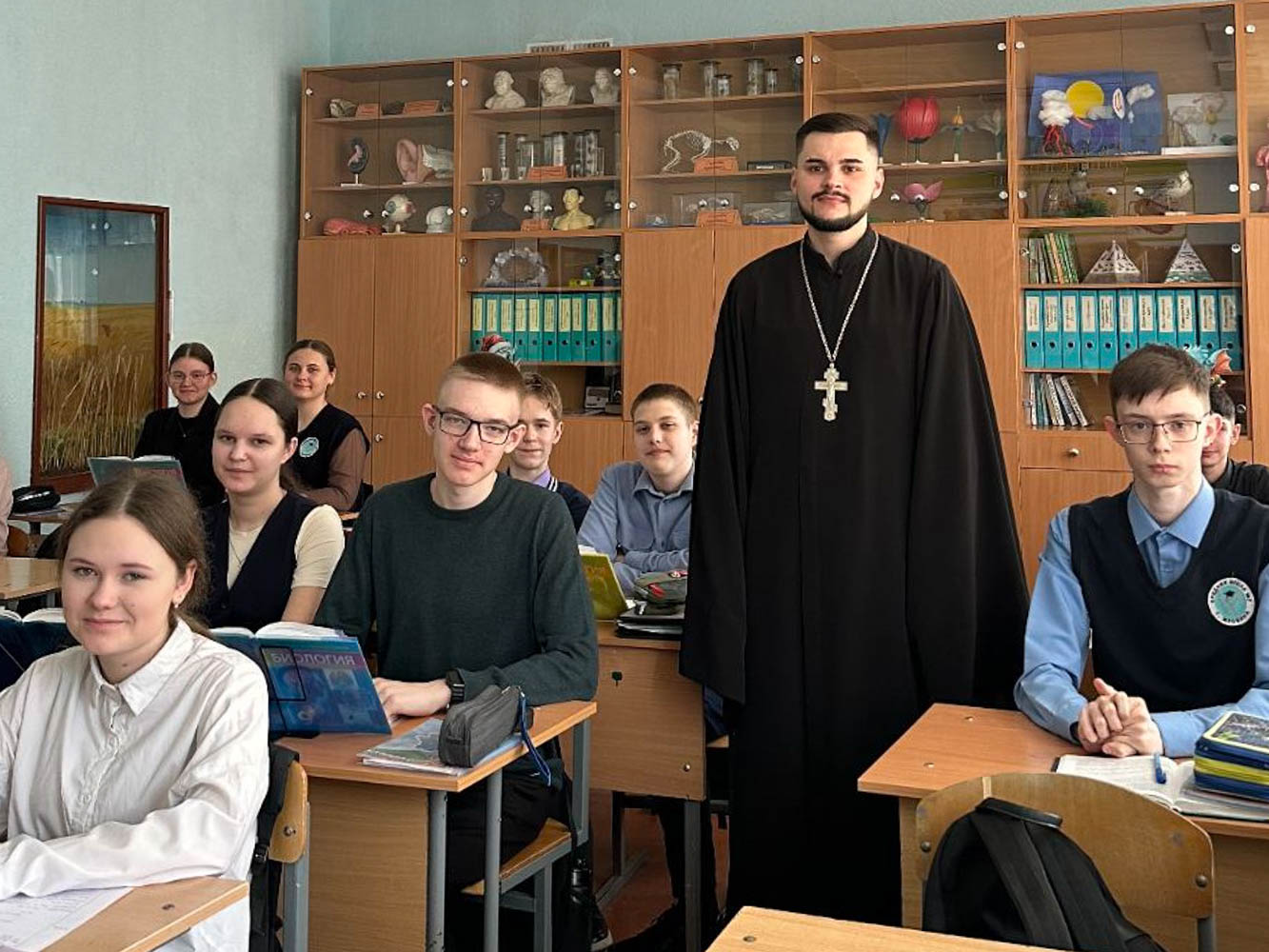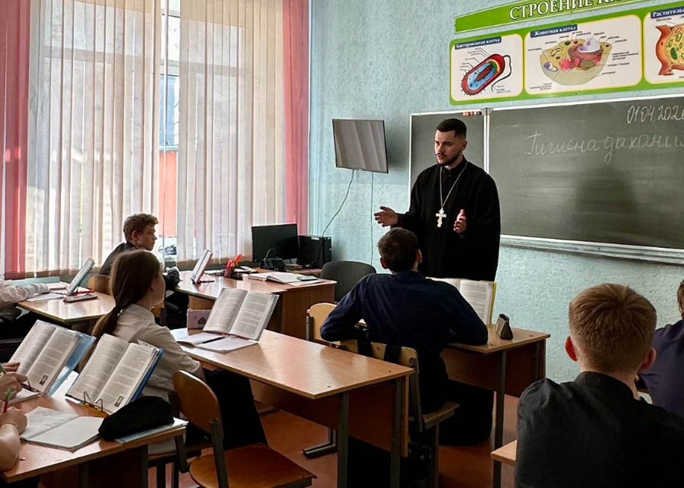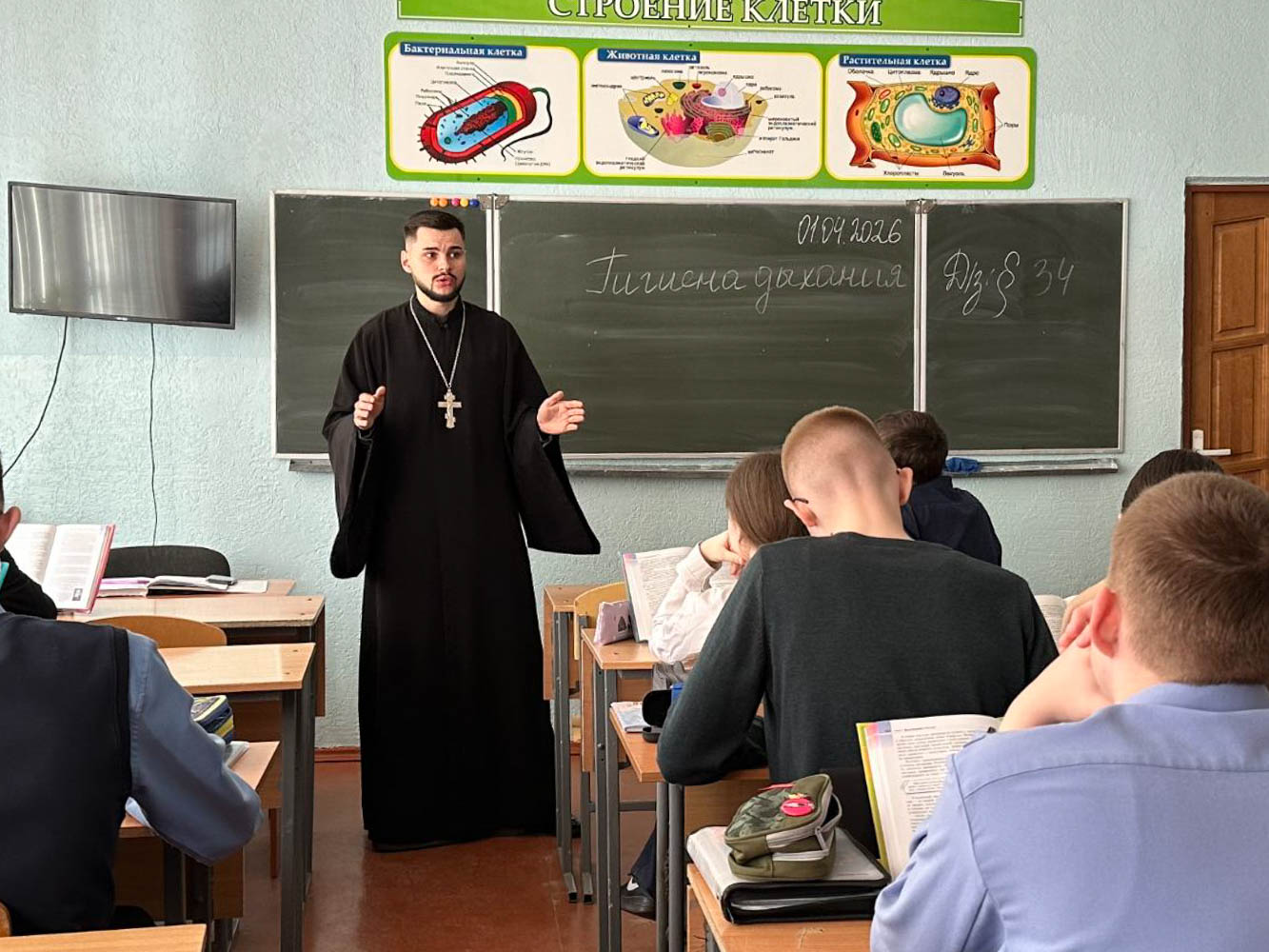 1 апреля клирик прихода храма в честь Святой Живоначальной Троицы в г.Жлобине иерей Георгий Чичов встретился с учащимися 9 класса средней школы № 7. Темой беседы стала «Жизнь по Святому Евангелию».
