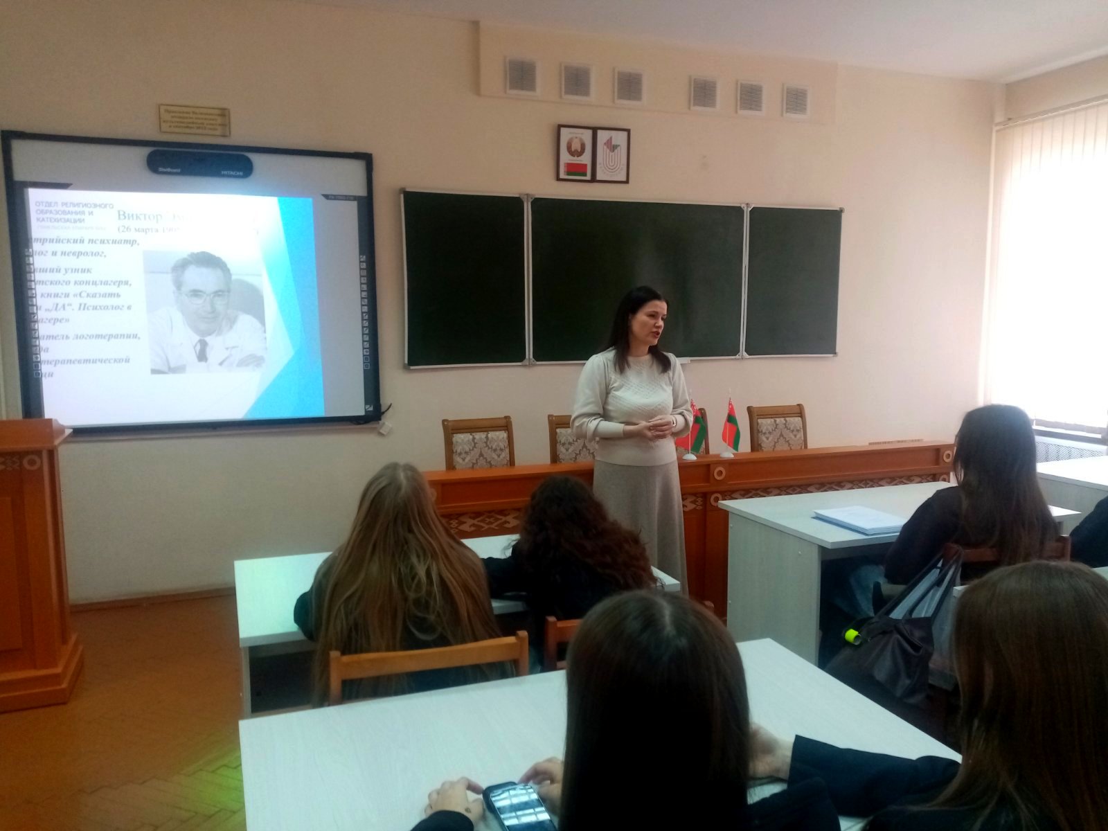 Перед студентами выступила Хомец С.А., координатор отдела религиозного образования и катехизации Гомельской епархии. В своем выступлении она затронула духовные аспекты жизни человека, подчеркнула значимость внутреннего развития, ответственности за свои поступки и стремления к добру.