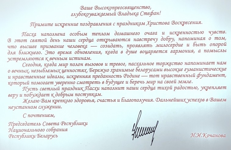 Поздравительный адрес от председателя Совета Республики Национального собрания Республики Беларусь Н.И.Кочановой