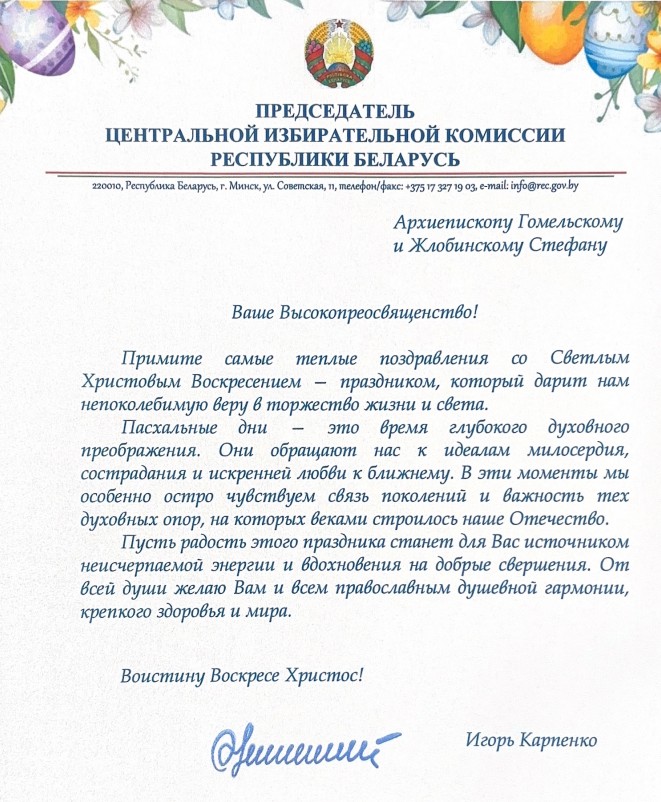 Поздравительный адрес от Председателя Центральной избирательной комиссии Республики Беларусь И.В.Карпенко