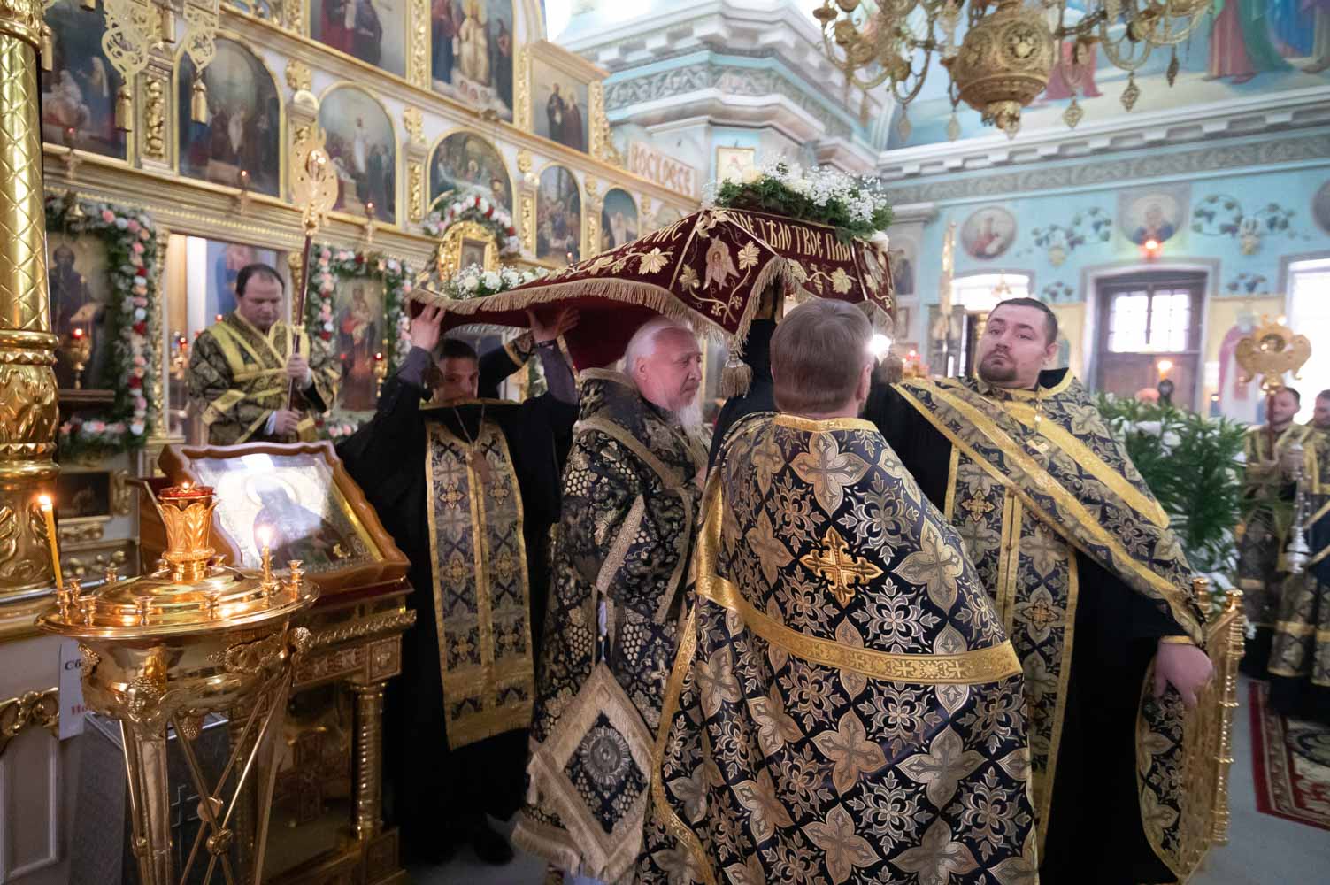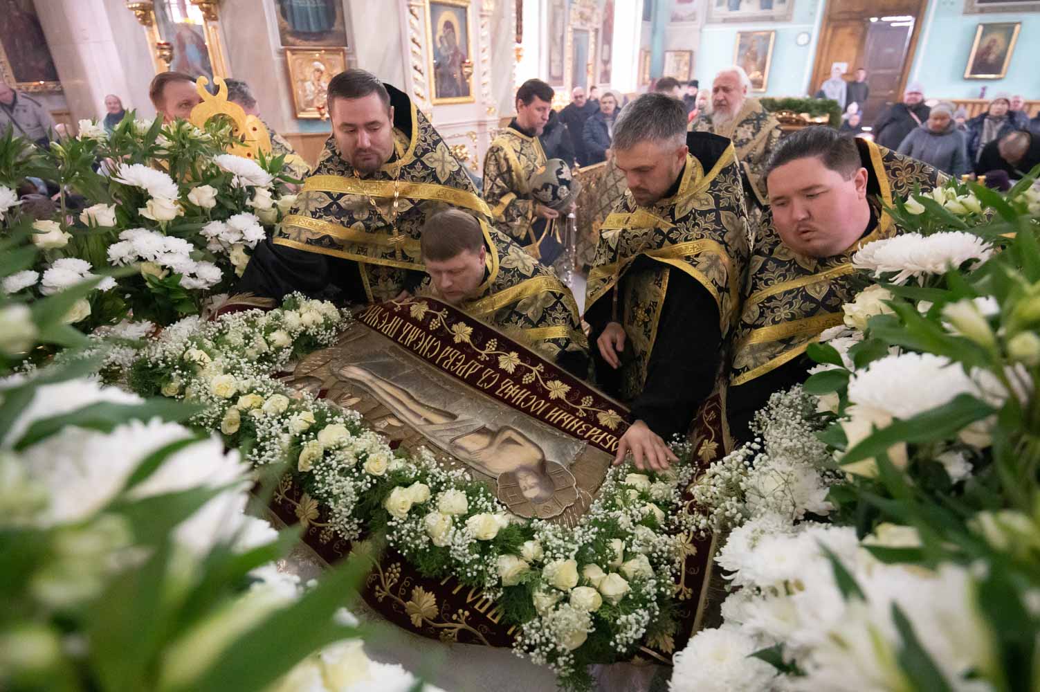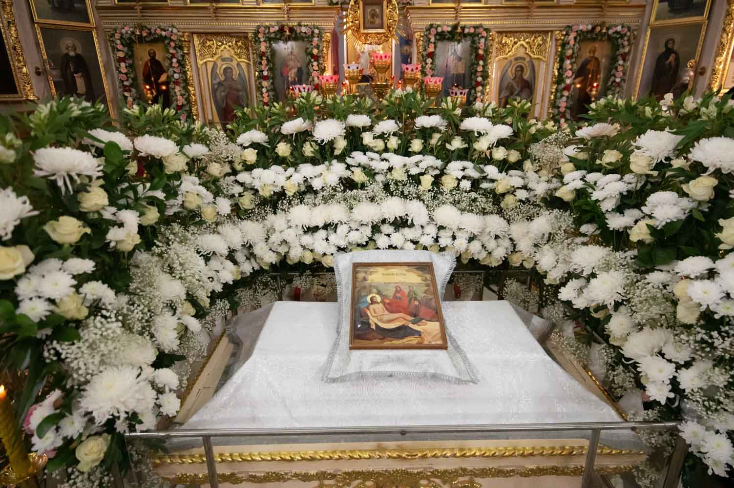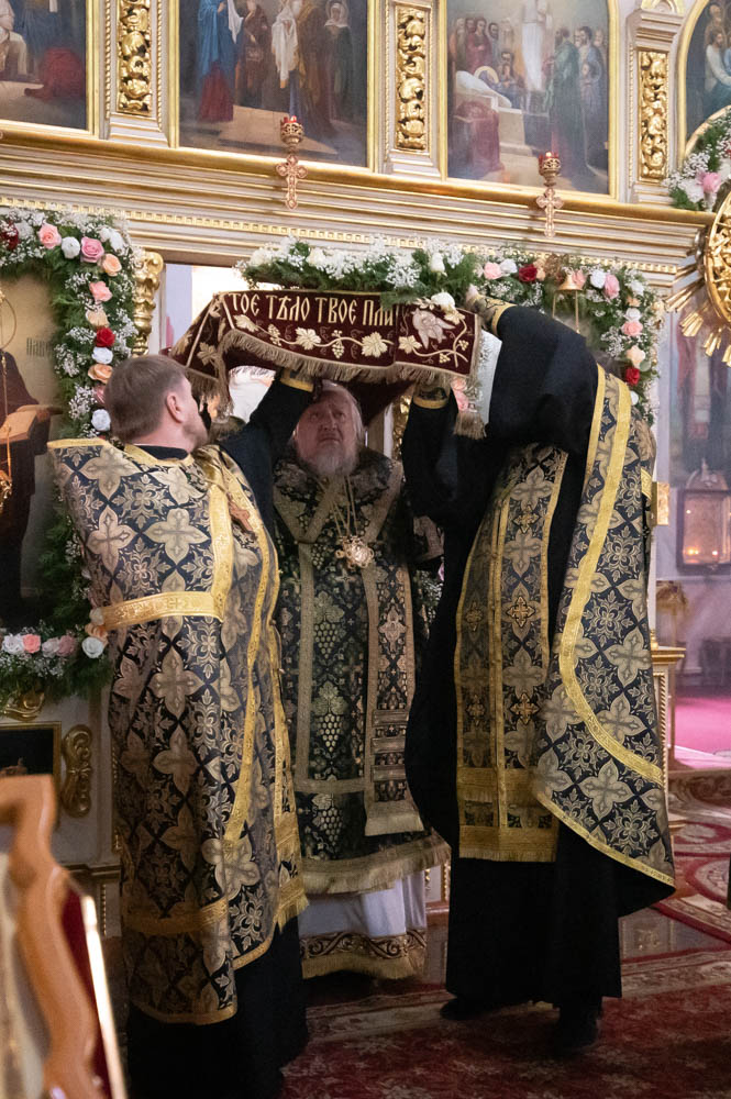 Под пение тропаря Великого пятка «Благообразный Иосиф, с древа снем Пречистое Тело Твое» архипастырь и священнослужители совершили вынос Святой Плащаницы из алтаря на середину храма, положив ее на «гробнице». На середину Плащаницы положено было Евангелие — свидетельство того, что Христос и мёртвый остаётся Живым Словом Божиим.