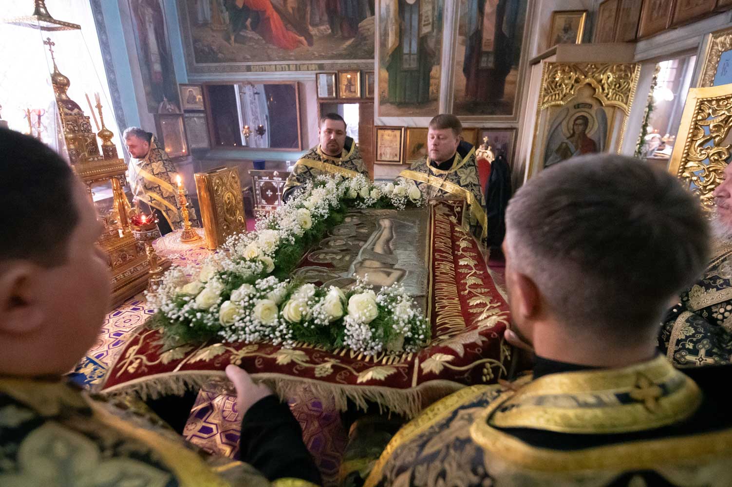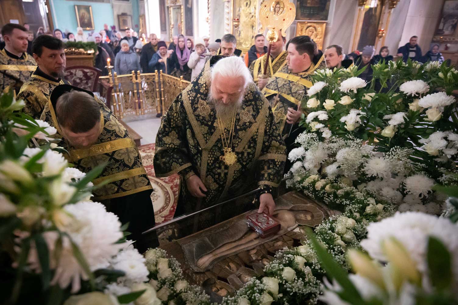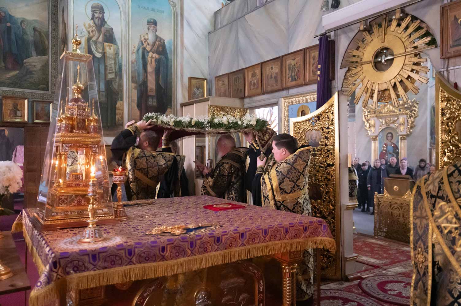 Под пение тропаря Великого пятка «Благообразный Иосиф, с древа снем Пречистое Тело Твое» архипастырь и священнослужители совершили вынос Святой Плащаницы из алтаря на середину храма, положив ее на «гробнице». На середину Плащаницы положено было Евангелие — свидетельство того, что Христос и мёртвый остаётся Живым Словом Божиим.