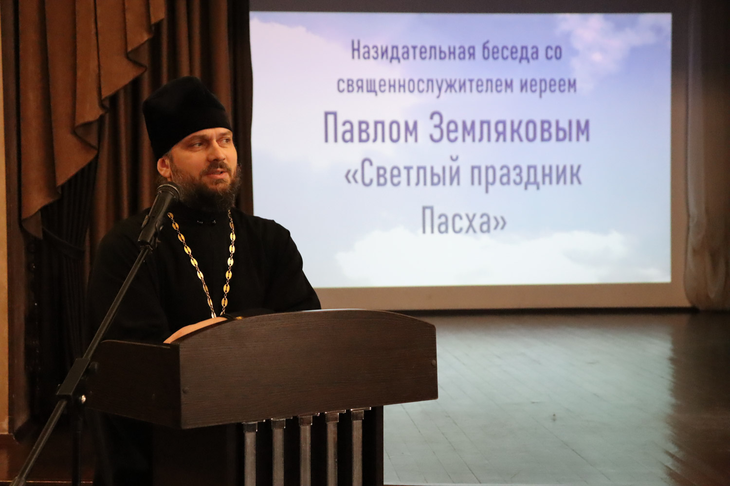После вручения сертификатов священнослужитель провёл беседу на тему Пасхи Христовой. Разговор был посвящён смыслу Воскресения Спасителя, надежде, которую несёт этот праздник, и тому, как евангельская весть о победе жизни над смертью обращена к каждому человеку, в каких бы обстоятельствах он ни находился.