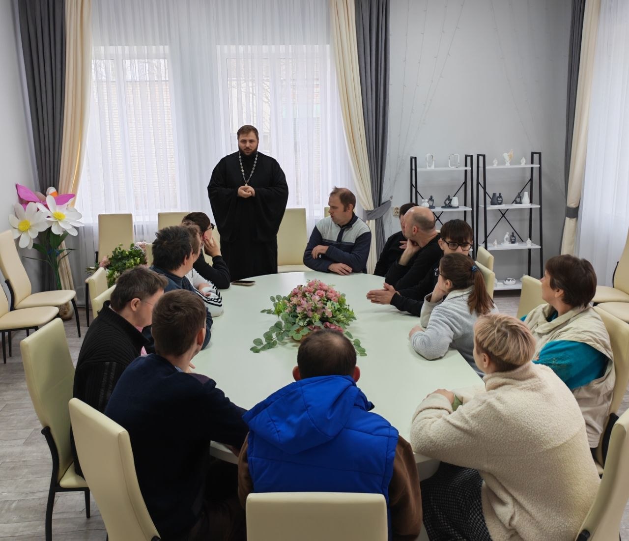 Благочинный Рогачёвского церковного округа иерей Алексей Сергеев встретился с подопечными отделения социальной реабилитации и абилитации и побеседовал о духовном смысле последних дней перед Пасхой.