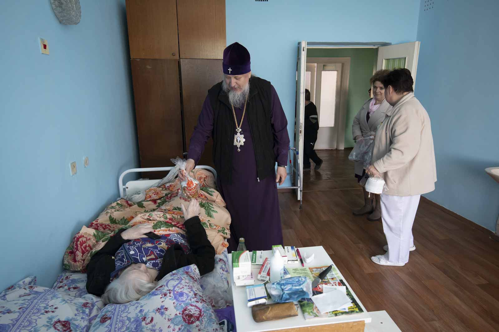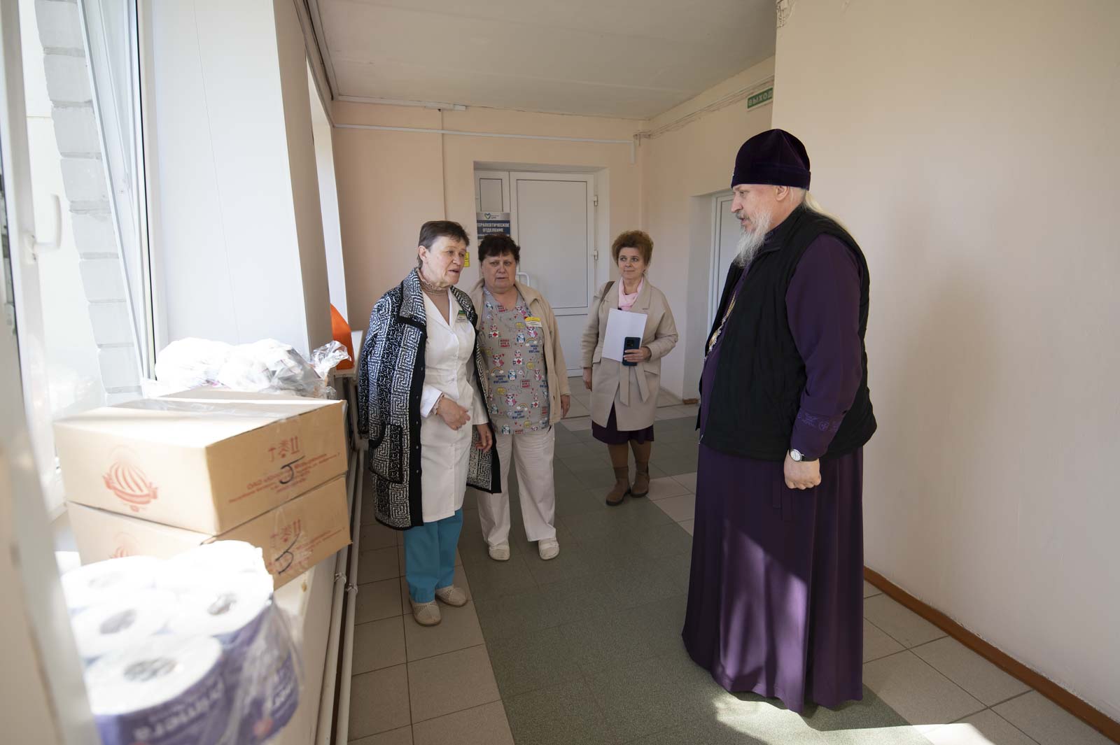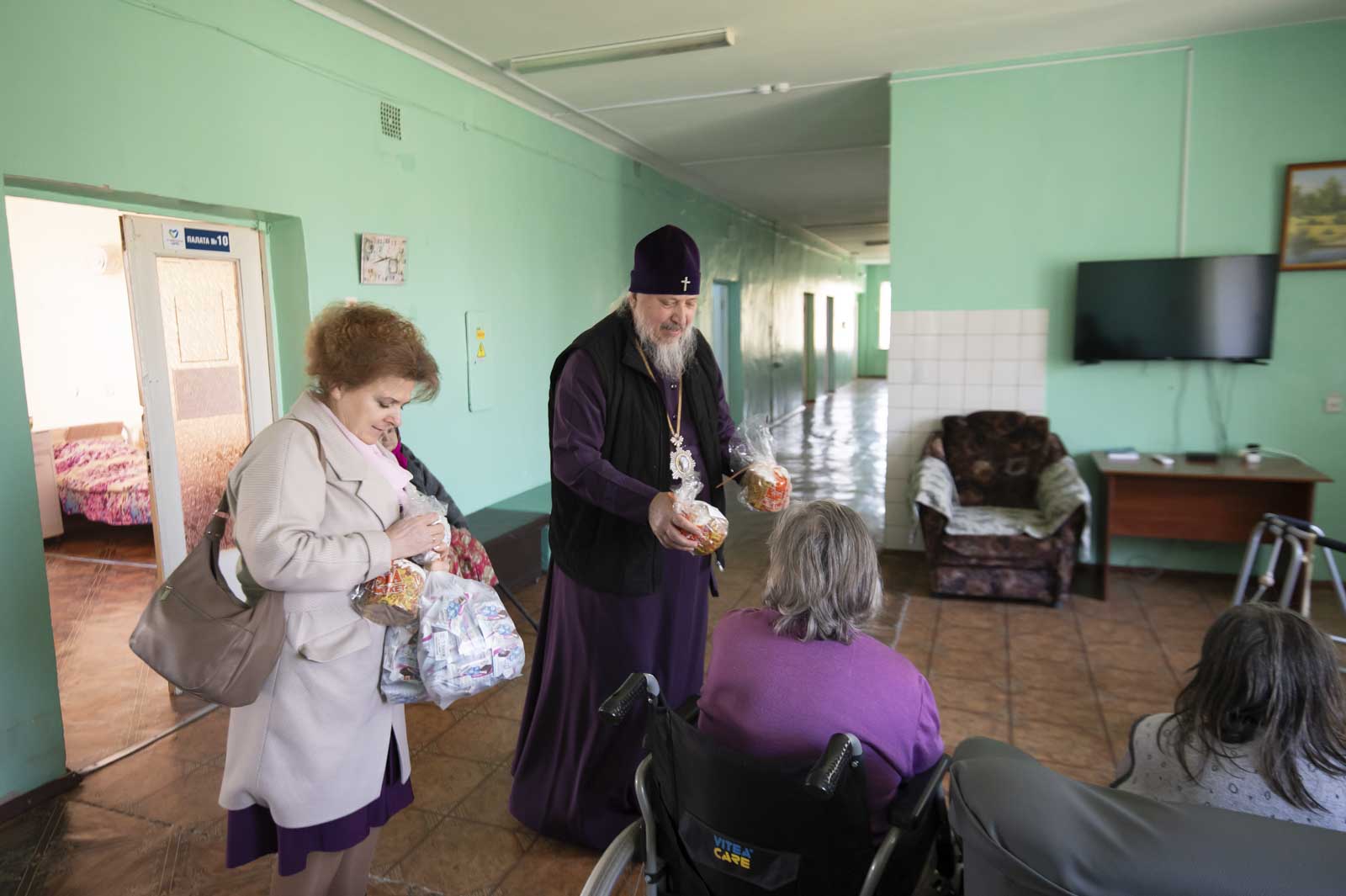 Затем архиепископ Стефан посетил больницу в Тереховке, где в палатах сестринского ухода находятся 34 пациента. Это пожилые и немощные люди, которым требуется постоянная помощь и уход. В дни Пасхи особенно важно, чтобы и они не были лишены внимания и заботы. Архипастырь зашел в палаты, побеседовал с пациентами, поздравил их с праздником Светлого Христова Воскресения и вручил каждому пасхальные угощения — куличи, фрукты и соки. А для больницы были переданы средства гигиены и бытовая химия.