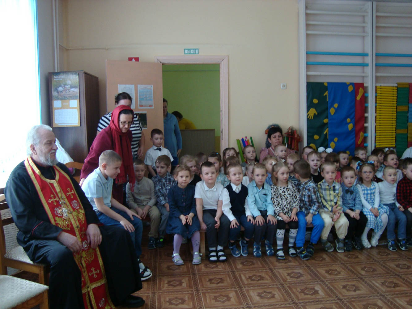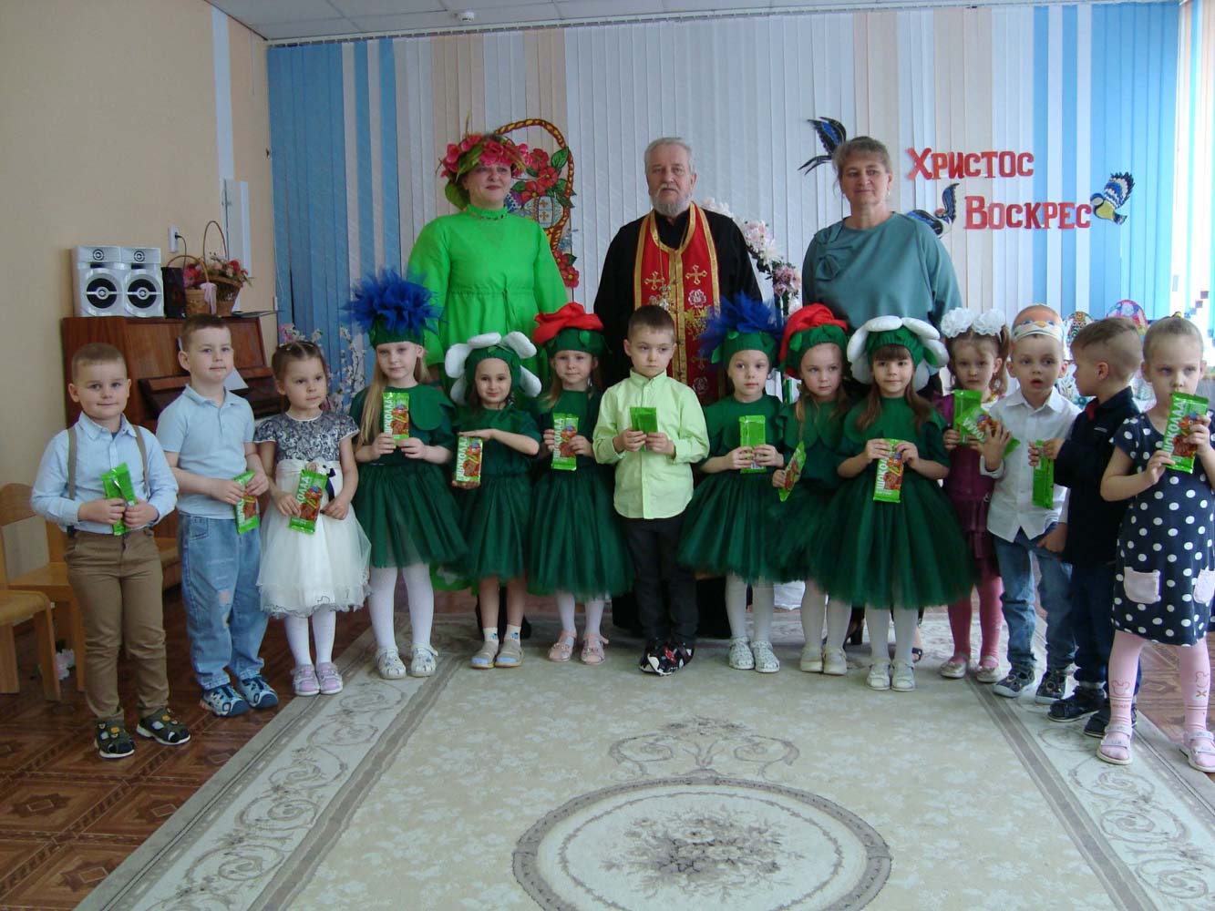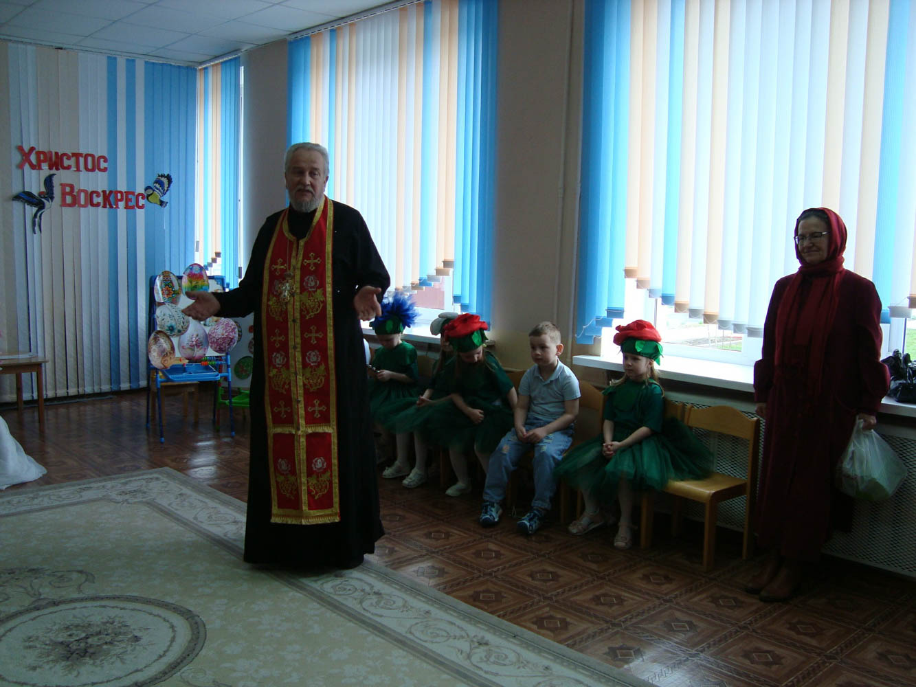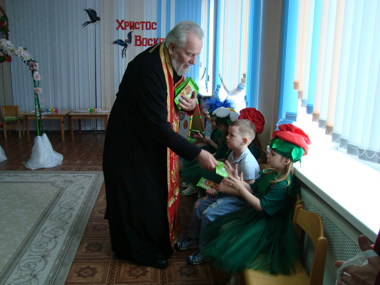 После просмотра священник поздравил ребят со Светлым Христовым Воскресением, пожелал им расти добрыми, внимательными друг к другу, радовать родителей и воспитателей. В завершение дети получили сладкие угощения.