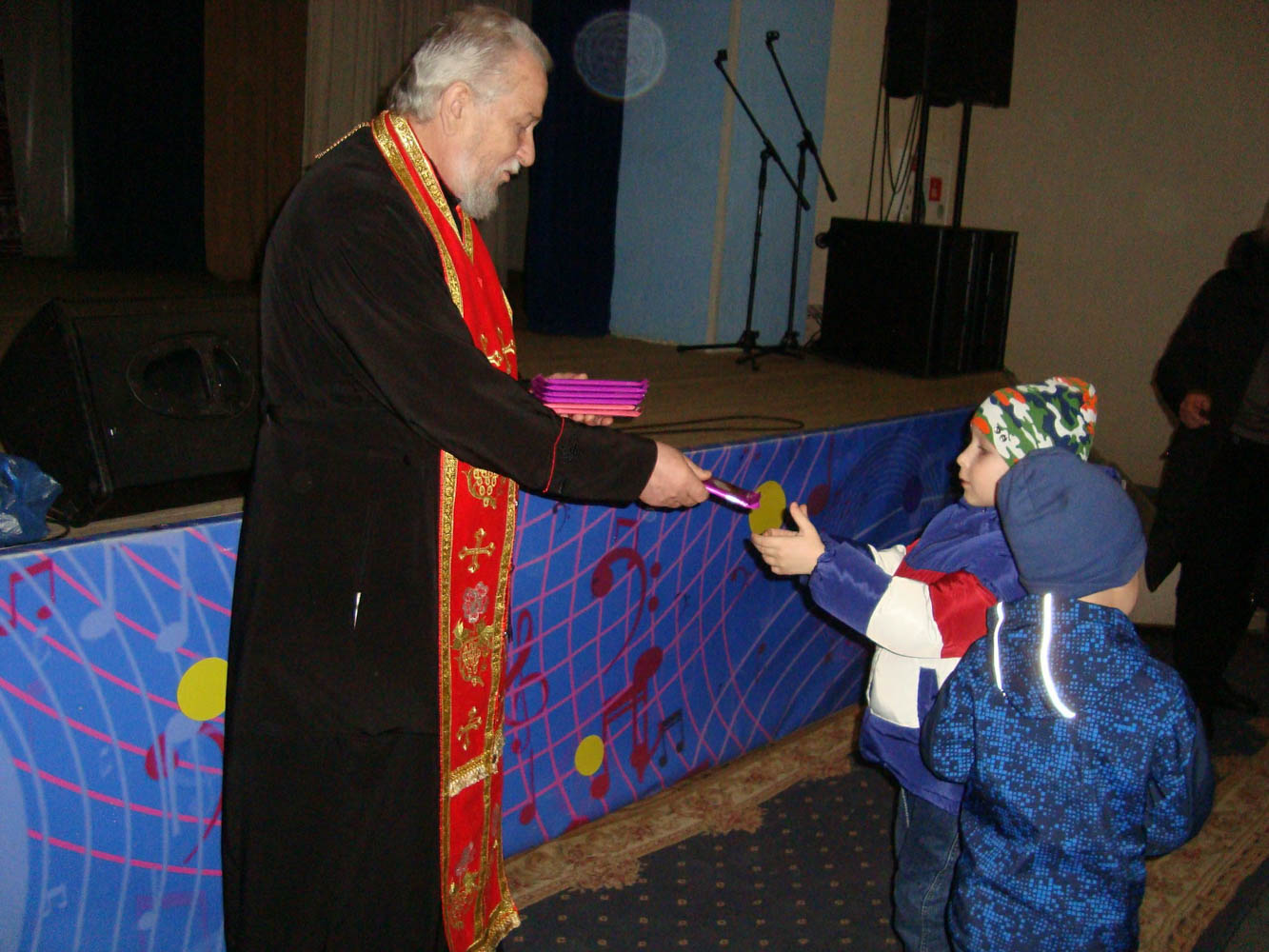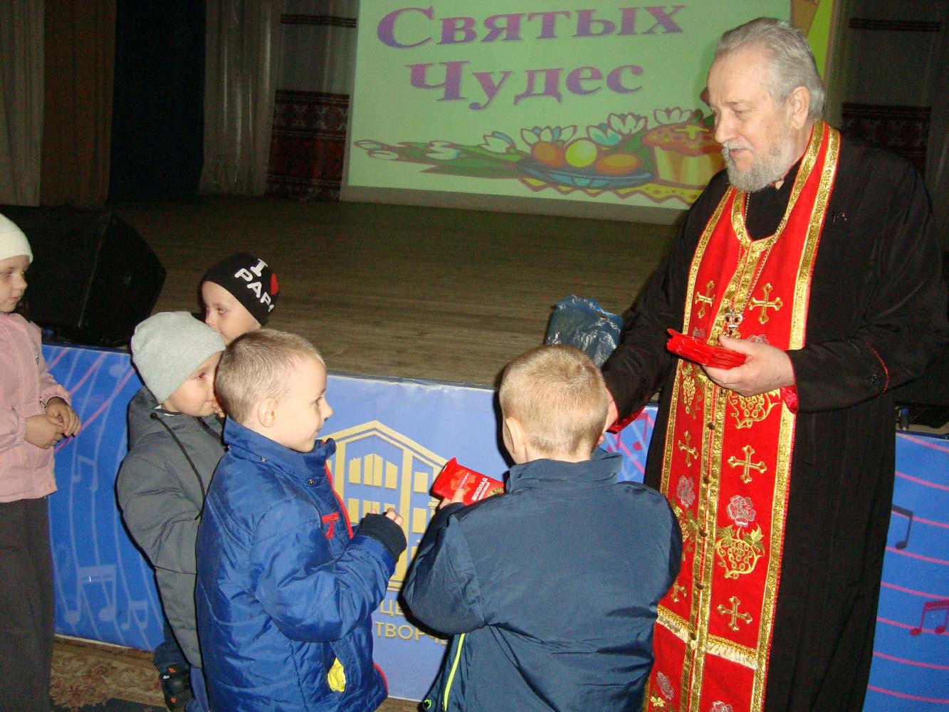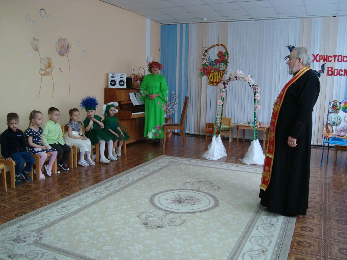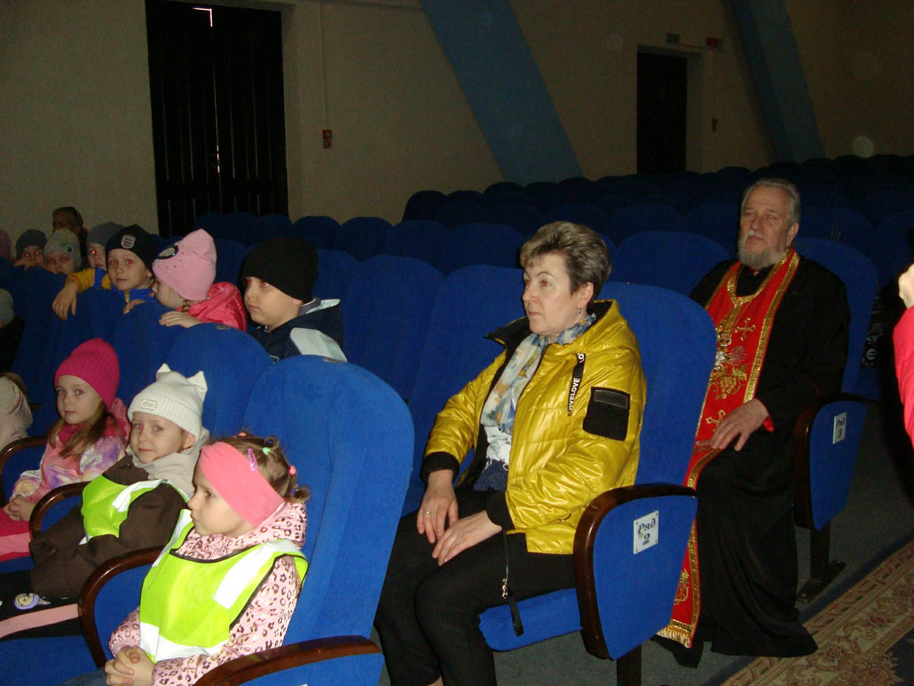 После просмотра священник поздравил ребят со Светлым Христовым Воскресением, пожелал им расти добрыми, внимательными друг к другу, радовать родителей и воспитателей. В завершение дети получили сладкие угощения.