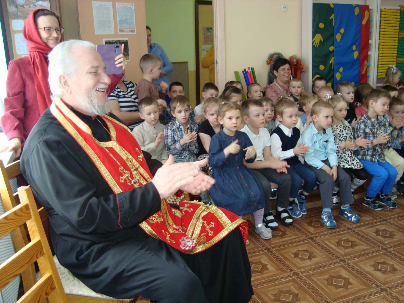 На следующий день, 15 апреля, протоиерей Михаил Борисёнок принял участие в праздничном утреннике в детском саду № 3 города Ветки. Под руководством музыкального руководителя Оксаны Кудиной воспитанники подготовили песни, стихи, загадки и игровые номера, посвящённые Пасхе. Священнослужитель поблагодарил организаторов и отметил, как важно, чтобы дети с ранних лет узнавали о празднике не формально, а через живое участие, слово, музыку и общую радость. В завершение он вручил ребятам сладкие подарки.