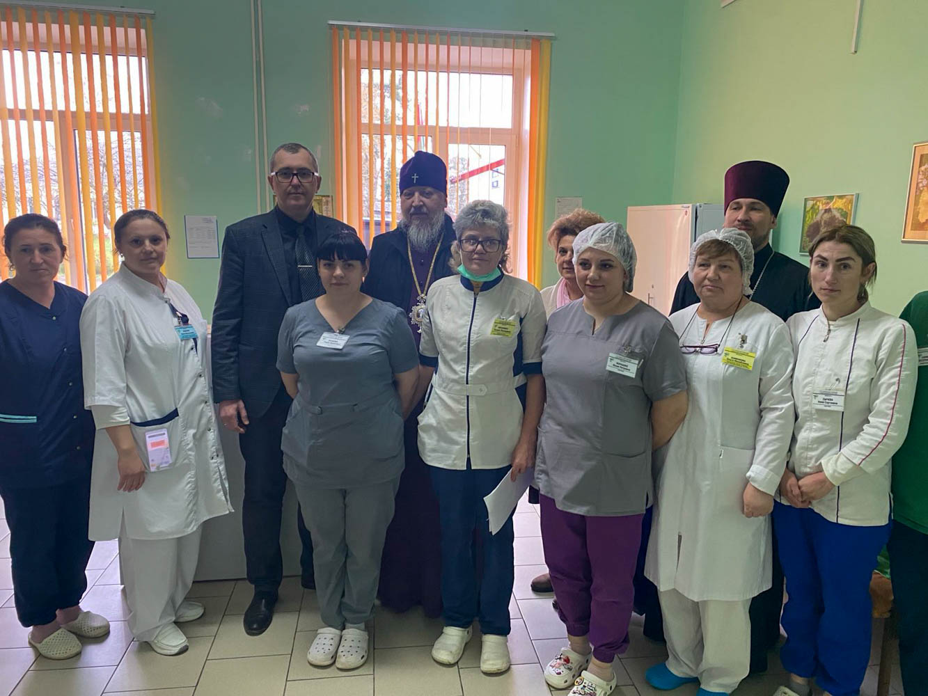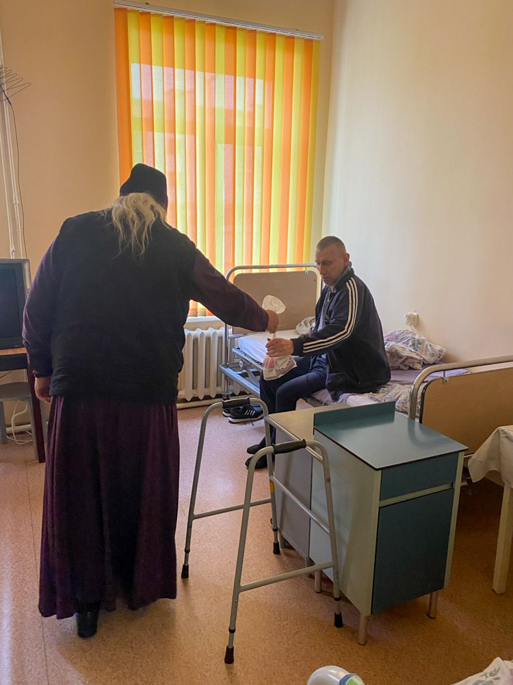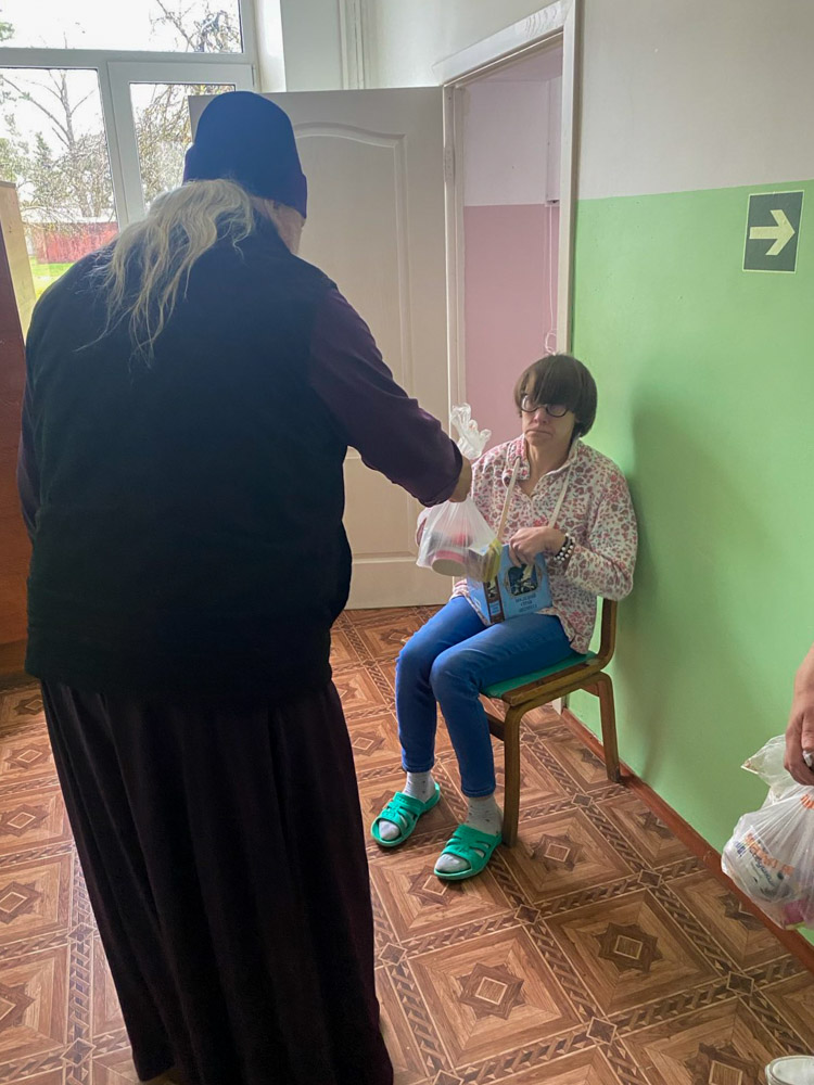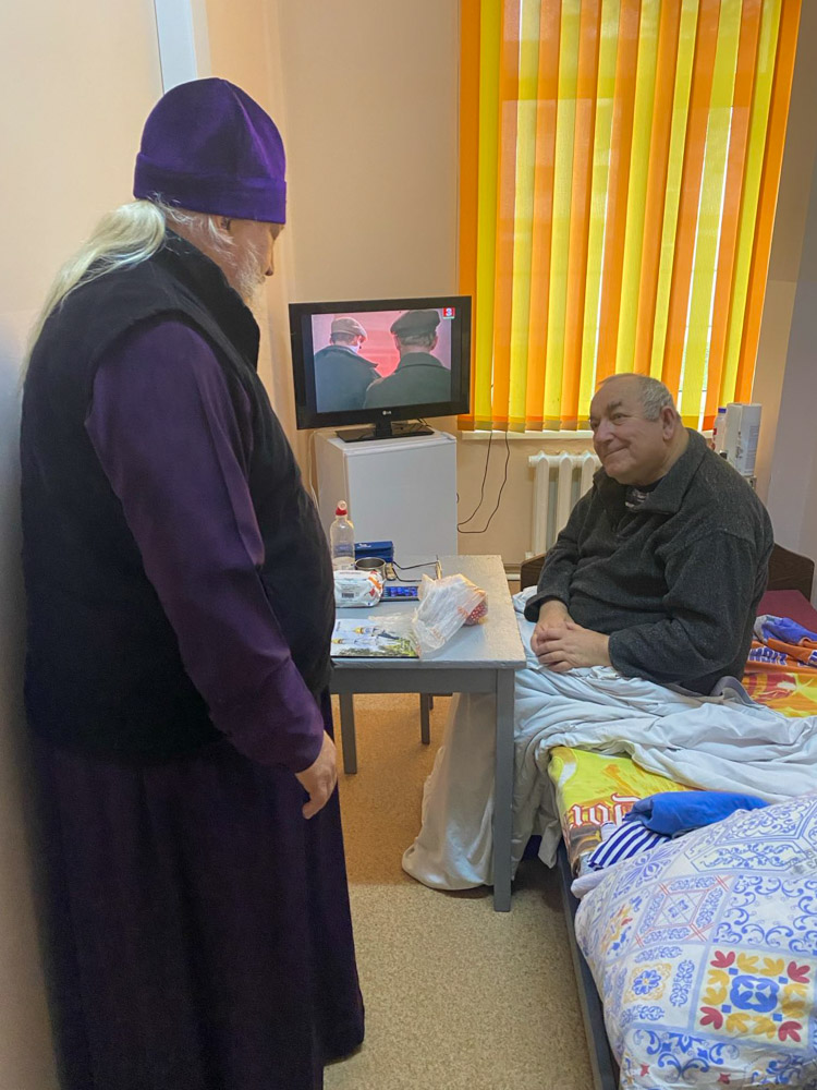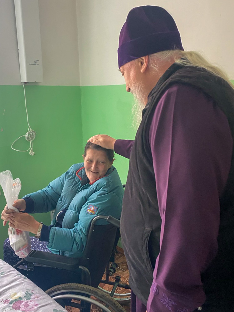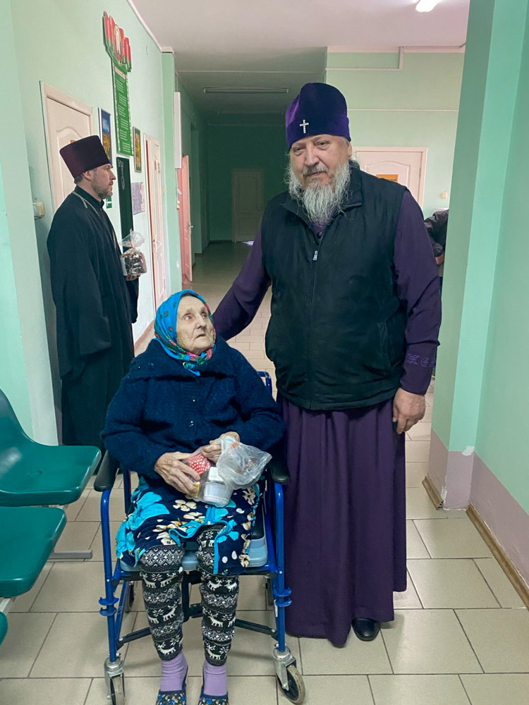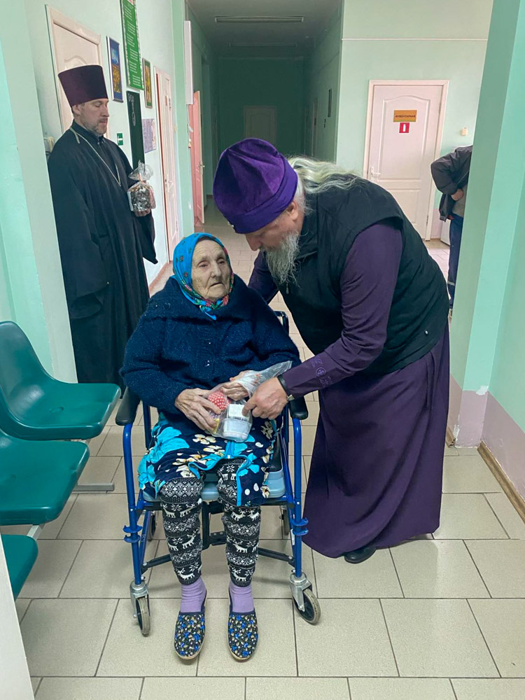 Во время визита владыка Стефан передал для нужд учреждения средства гигиены и бытовую химию, а каждому пациенту вручил пасхальный гостинец — кулич, сладости и молочную продукцию.