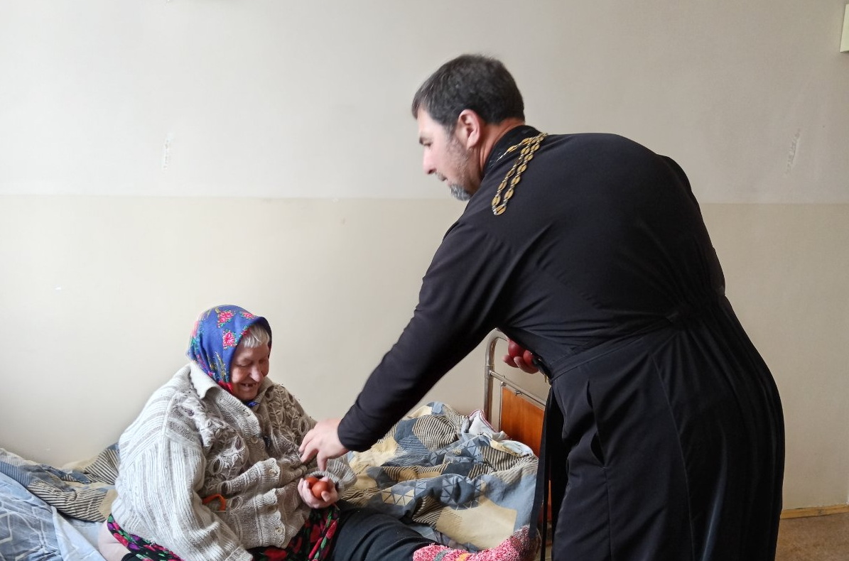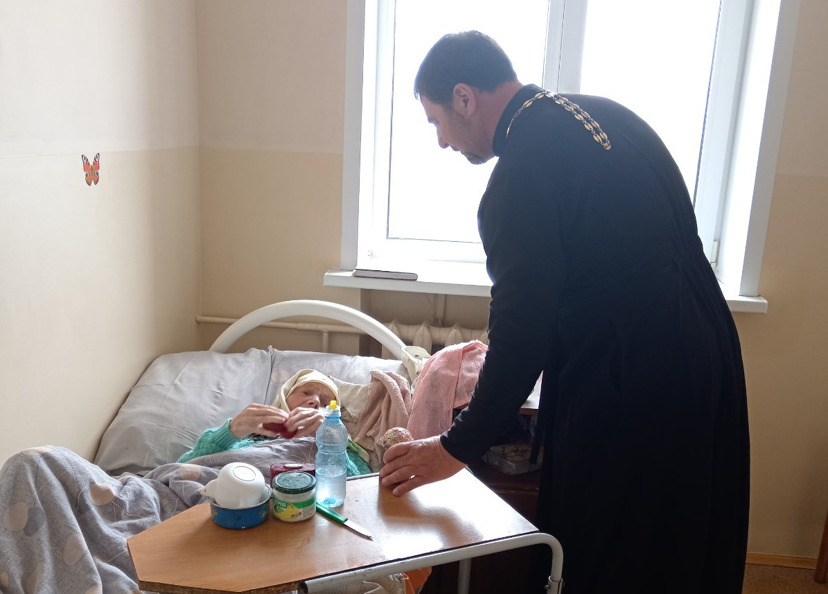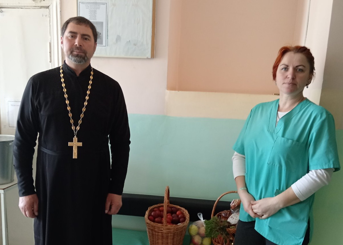 Пациенты Кировской больницы сестринского ухода встретили Воскресение Христово в тишине больничных палат. В этом месте острее ощущаешь, как необходимо человеку душевное тепло и участие: доброе слово, внимательный взгляд, искренняя забота. 13 апреля настоятель прихода храма Покрова Пресвятой Богородицы в агрогородке Кирово иерей Михаил Маркосян поздравил пациентов и сотрудников больницы с Воскресением Христовым, передал пасхальные угощения, приготовленные прихожанами храма преподобного Серафима Саровского.