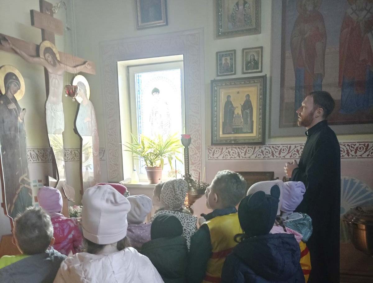 Образовательный вектор продолжил клирик прихода храма святого мученика Иоанна Воина диакон Артемий Турыгин. 14 апреля он провел экскурсию для воспитанников детского сада №39 г. Жлобина. В доступной форме священнослужитель раскрыл святоотеческое учение о Воскресении как источнике преображения личности. Особое внимание в беседе было уделено христианским добродетелям: послушанию, неосуждению сверстников и милосердию.