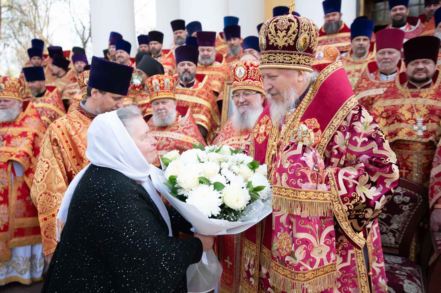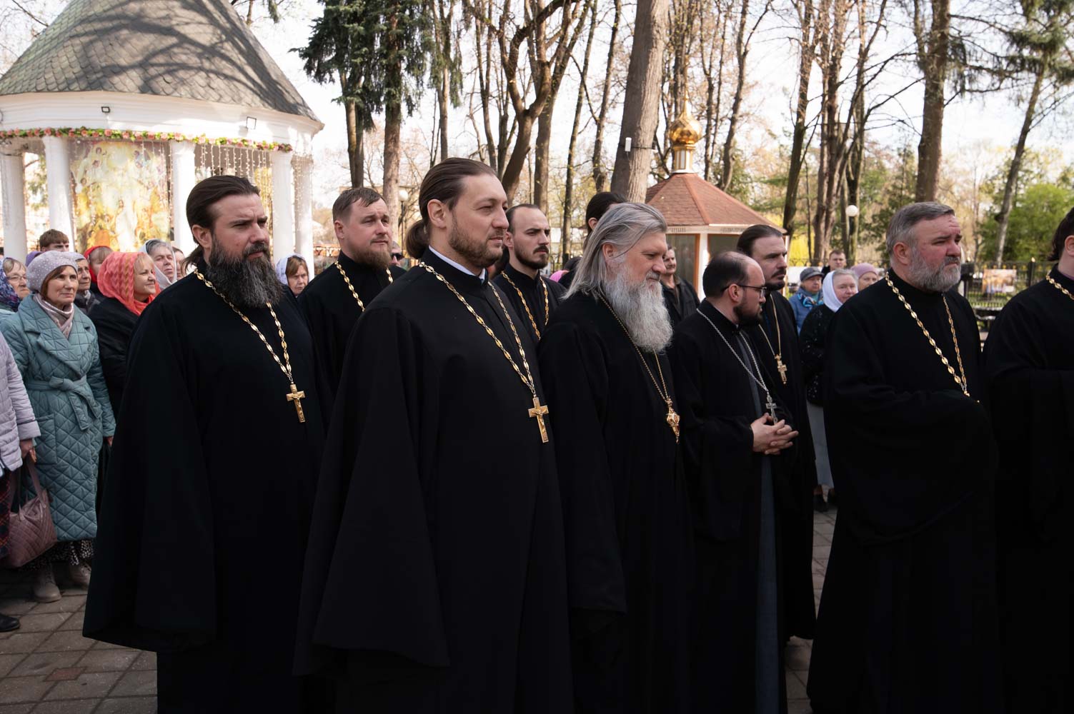 В завершении Литургии было вознесено многолетие Предстоятелю Русской Православной Церкви Святейшему Патриарху Кириллу, Высокопреосвященнейшему Вениамину, митрополиту Минскому и Заславскому Патриаршему Экзарху всея Беларуси, Высокопреосвященнейшему Стефану, архиепископу Гомельскому и Жлобинскому, с их богоспасаемою паствою, сему священному собору, богохранимей стране нашей, властем, народу и воинству ея, граду сему и живущим в нем, настоятелю, братии и прихожанам святаго храма сего, и всем зде предстоящим и молящимся, и сродником их и всем православным христианам.