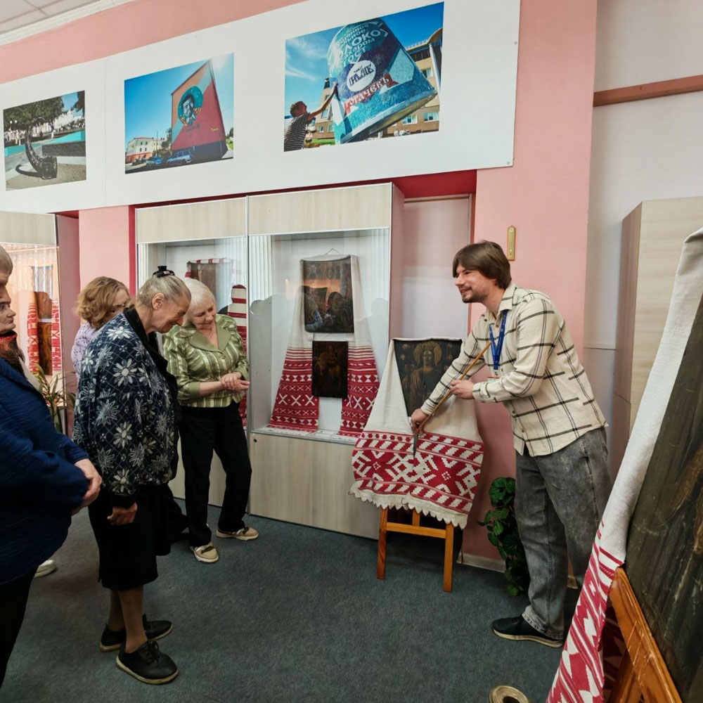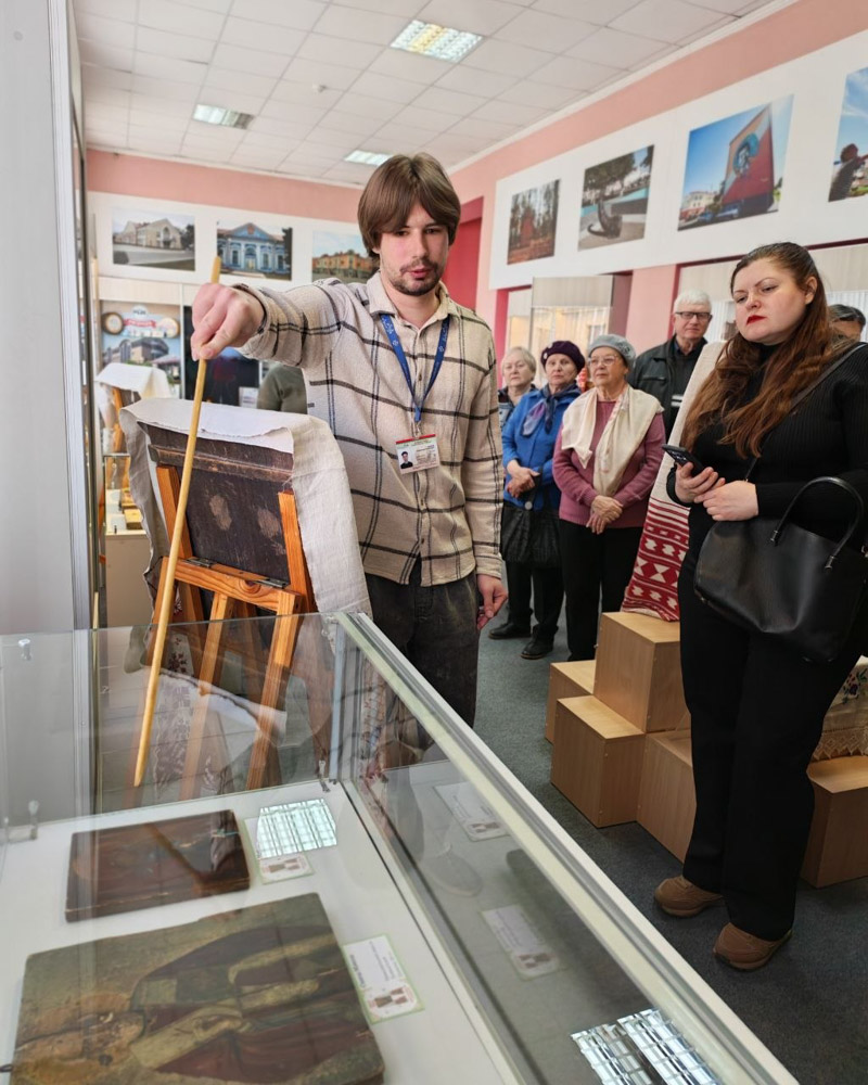 Экскурсию для первых гостей провёл старший научный сотрудник музея, куратор выставки Владислав Можаров. Он рассказал о происхождении и особенностях народной иконописи Рогачёвщины, о влиянии различных традиций и о том, как формировались местные художественные школы.