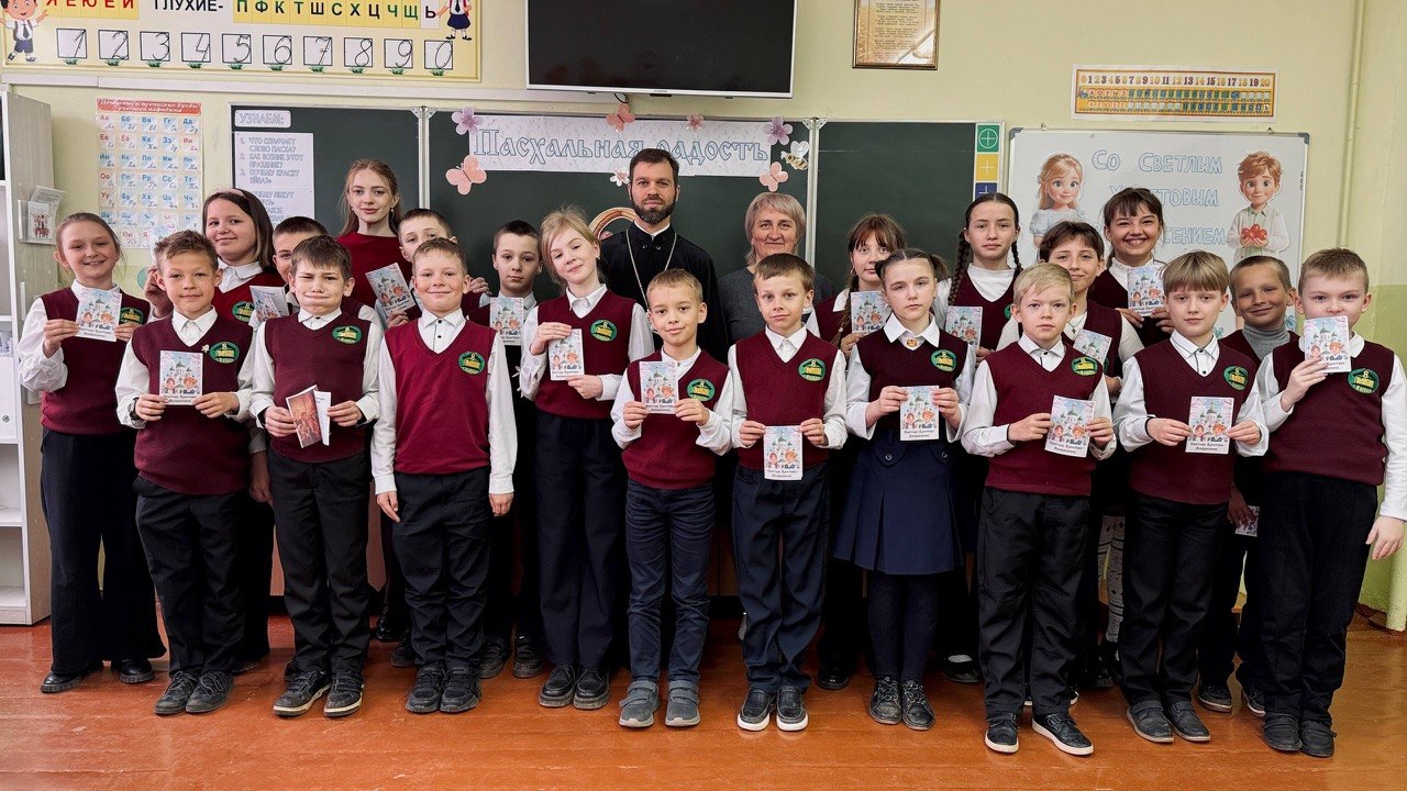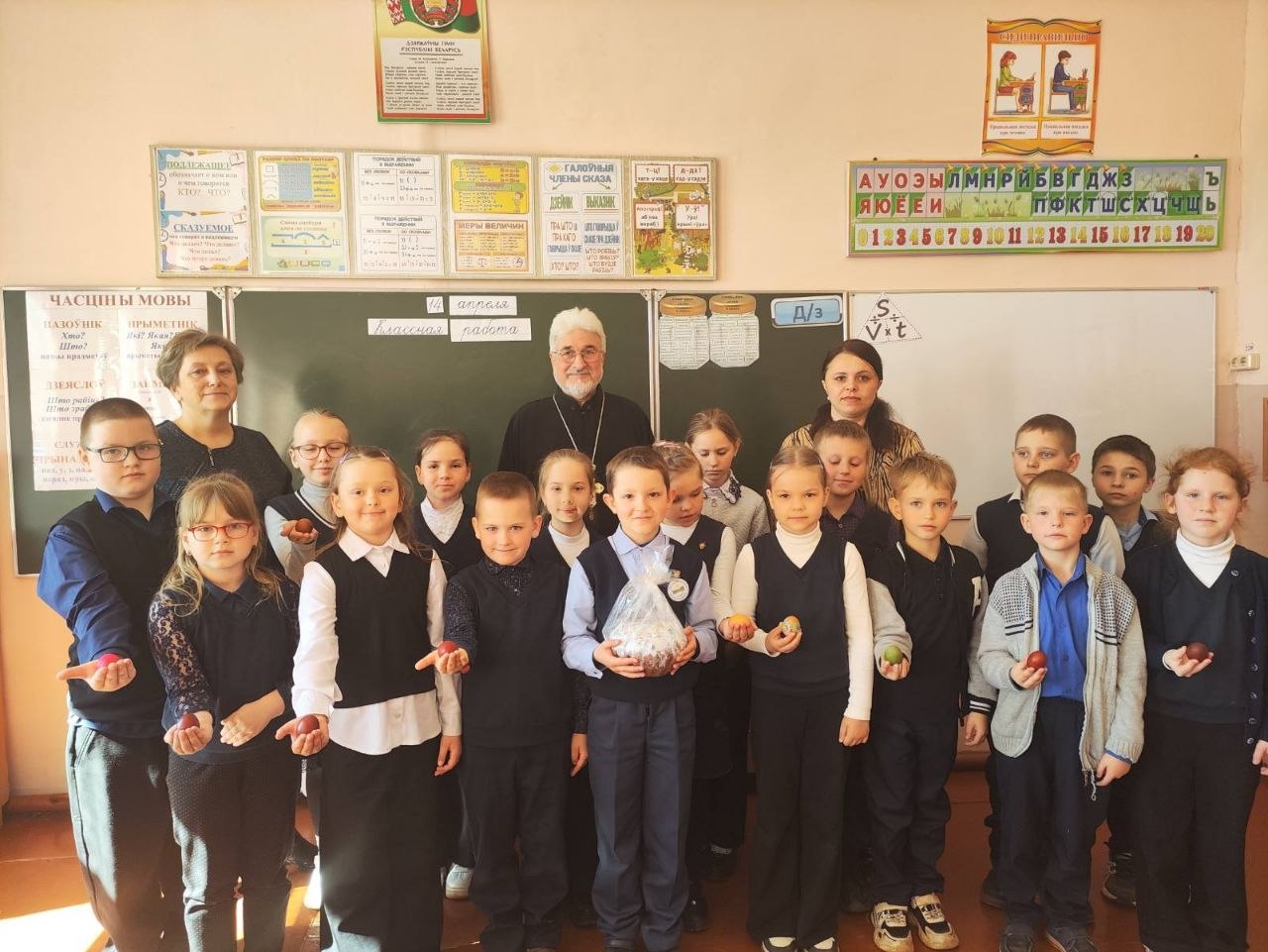 14 апреля в Радушской школе состоялась встреча настоятеля прихода храма святого великомученика Георгия Победоносца аг. Красный Берег протоиерея Петра Петрушенко с учащимися 1–4 классов. Священник напомнил ребятам о значении Великого поста как времени, когда человек учится внимательнее смотреть на себя: вспоминать свои поступки, замечать, кого обидел, где был неправ, и искренне просить прощения. Основное внимание было посвящено рассказу о Светлом Христовом Воскресении, главном празднике христиан, в котором открывается победа Жизни над смертью. Узнали дети и о событиях Входа Господня в Иерусалим, а также о том, почему в русской традиции пальмовые ветви были заменены вербой. Завершилась встреча по-праздничному тепло: детям вручили кулич и крашеные яйца.