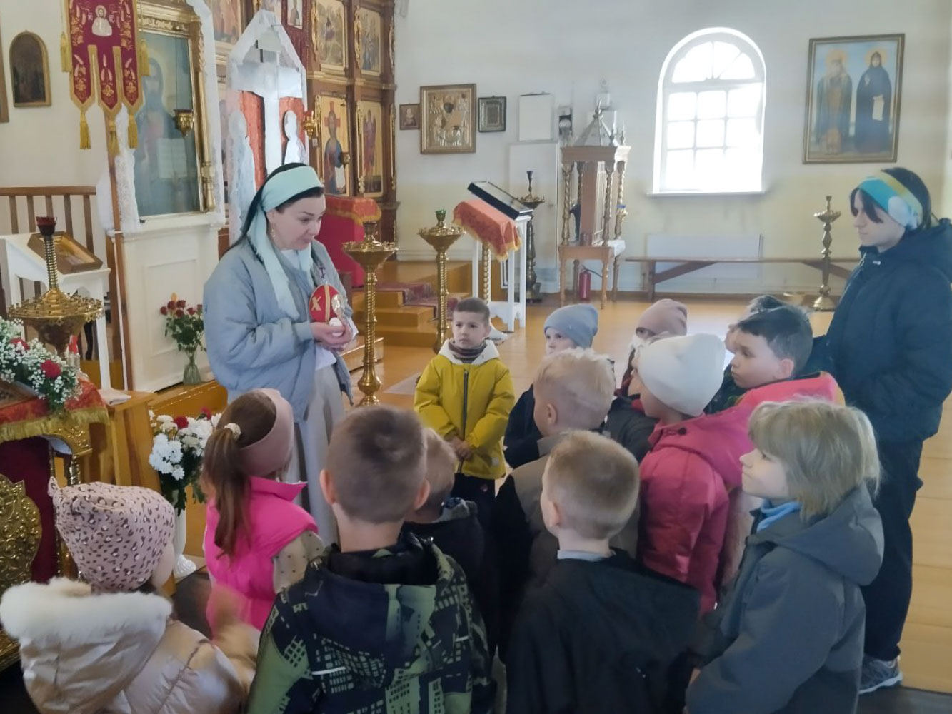 На Светлой седмице дошкольники в рамках экскурсии посетили Храм Святой Живоначальной Троицы г.п.Лоев. Специалист по приходскому просвещению Людмила Карпенко рассказала ребятам о значении красного и белого цвета, используемых в эти дни для украшения Храма. Ребята услышали истории о св. Марии Магдалине, первой возвестившей радостную весть о воскресшем Спасителе. Стоя у Святого Распятия, ребята узнали о Пресвятой Богородице и апостоле Иоанне Богослове. Настоятель прихода Храма иерей Димитрий Чварков рассказал дошкольникам о том, что такое Алтарь в Церкви, а также объяснил, что обозначает изображение голубя на некоторых иконах и над Царскими вратами. В завершении экскурсии ребята рассказали о том, какие иконы есть у них дома, а также поделились своими знаниями о том, что такое Добро и Зло. По традиции завершилась встреча сладким угощением для ребят.
