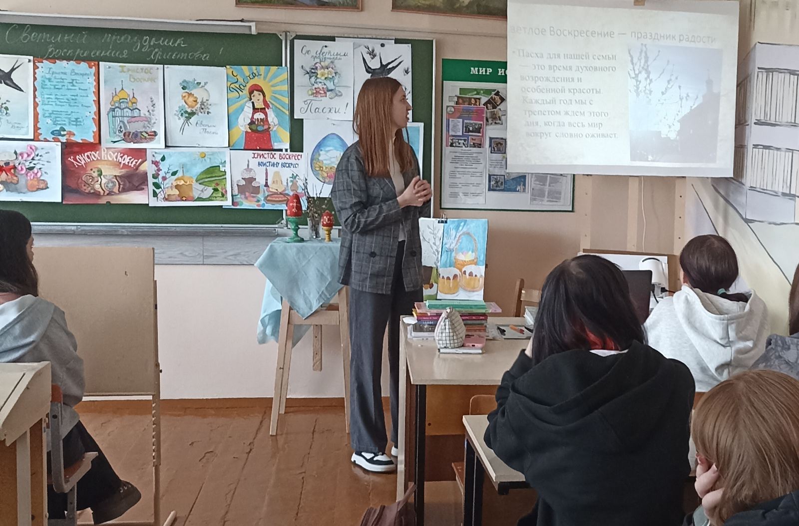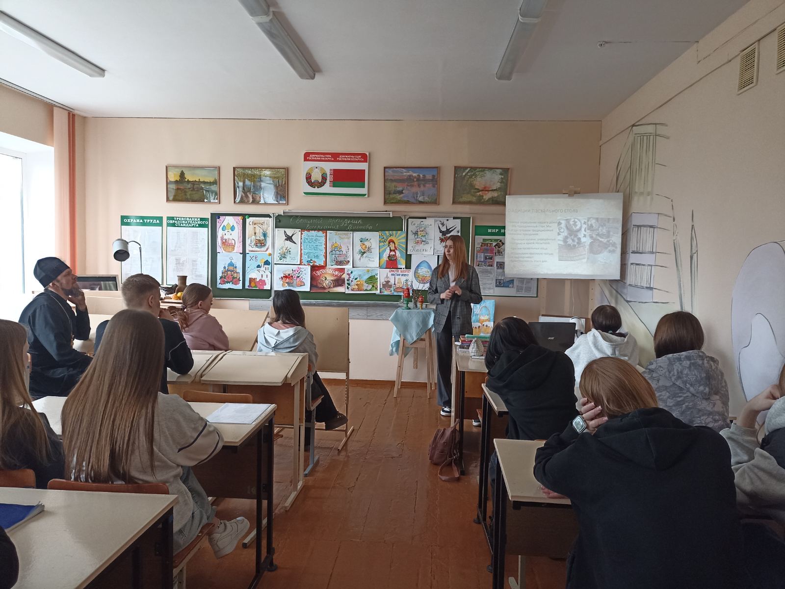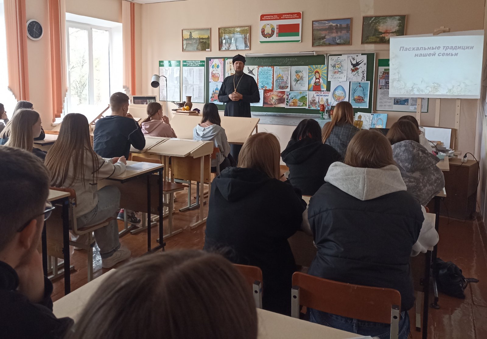 В учреждениях образования прошли тематические беседы, посвященные празднику Пасхи. А ребята из Лоевского государственного педагогического колледжа пригласили иерея Димитрия Чваркова на круглый стол, посвященный семейным Пасхальным традициям. Посредством презентаций учащиеся рассказали о том, как они встречают Светлый праздник со своими родными. Особенность этой встречи заключалась в том, что в одной группе собрались ребята из разных уголков нашей Беларуси, в каждом из которых есть свои местные Пасхальные традиции.